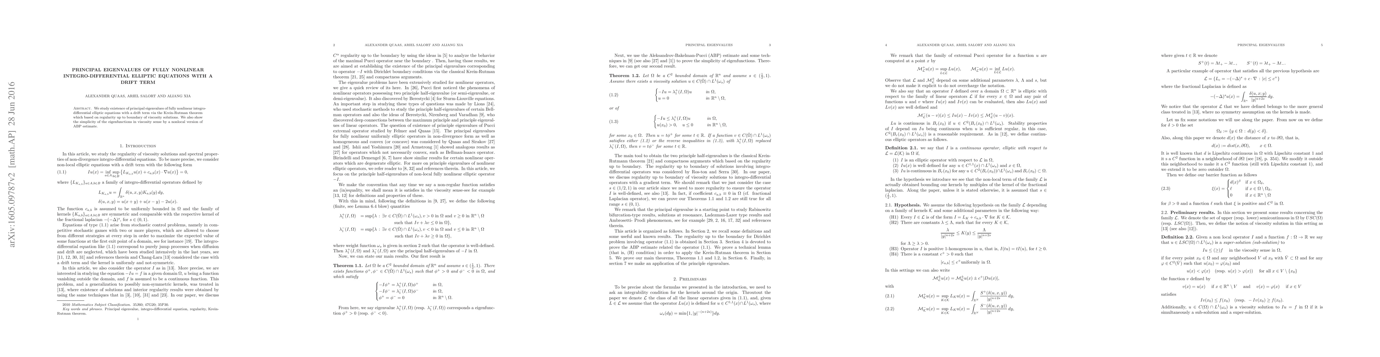 Summary: This paper investigates the existence of principal eigenvalues for fully nonlinear integro-differential elliptic equations with a drift term, utilizing the Krein-Rutman theorem and demonstrating the simplicity of eigenfunctions via a nonlocal version of the ABP estimate. Regularity up to the boundary of viscosity solutions is also considered.