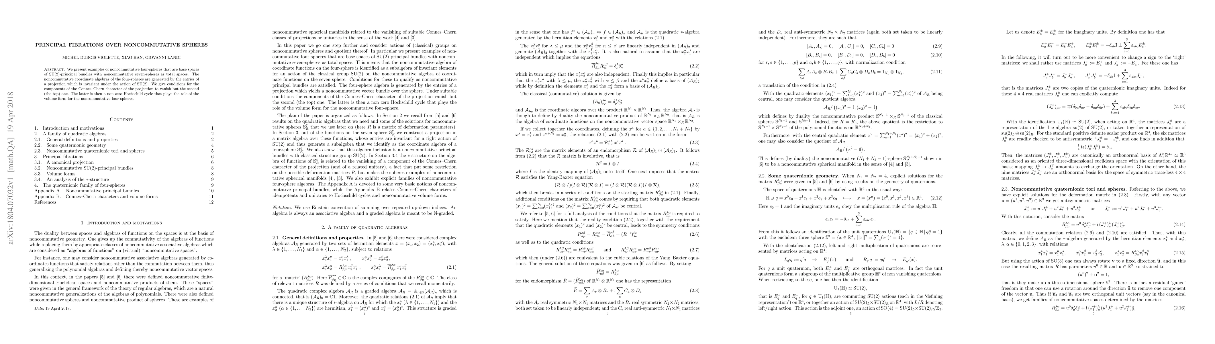 This paper provides examples of $SU(2)$-principal bundles where noncommutative four-spheres serve as base spaces and noncommutative seven-spheres as total spaces. It discusses conditions under which the components of the Connes-Chern character vanish except for the top component, which acts as a volume form for the noncommutative four-spheres.