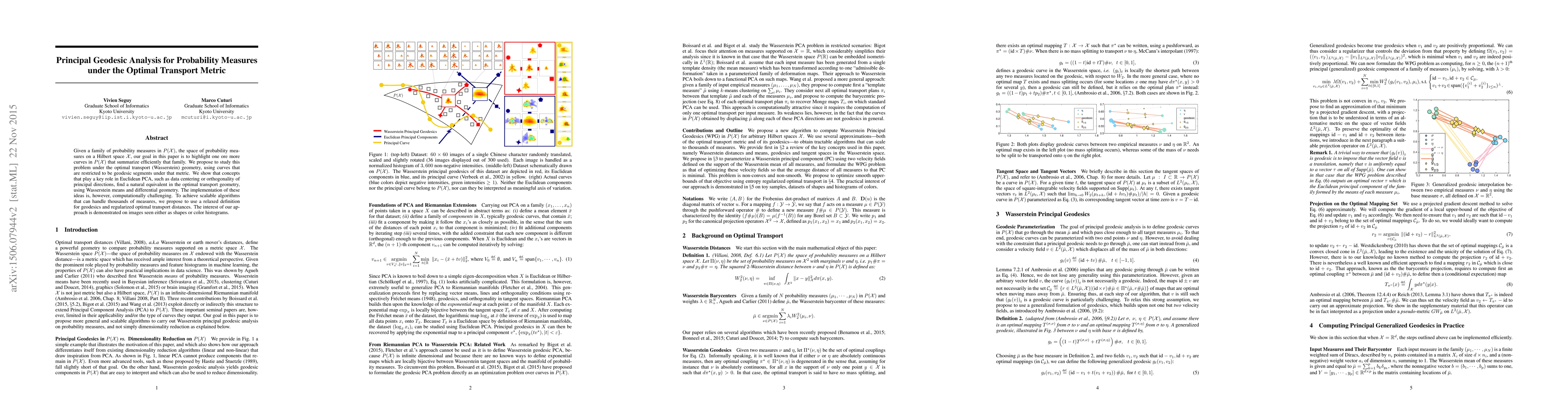 This paper proposes a method for summarizing families of probability measures in a Hilbert space using Principal Geodesic Analysis under the optimal transport (Wasserstein) metric. It introduces equivalent concepts to Euclidean PCA within this geometry and addresses computational challenges by using relaxed geodesics and regularized distances, demonstrating its effectiveness on image data.