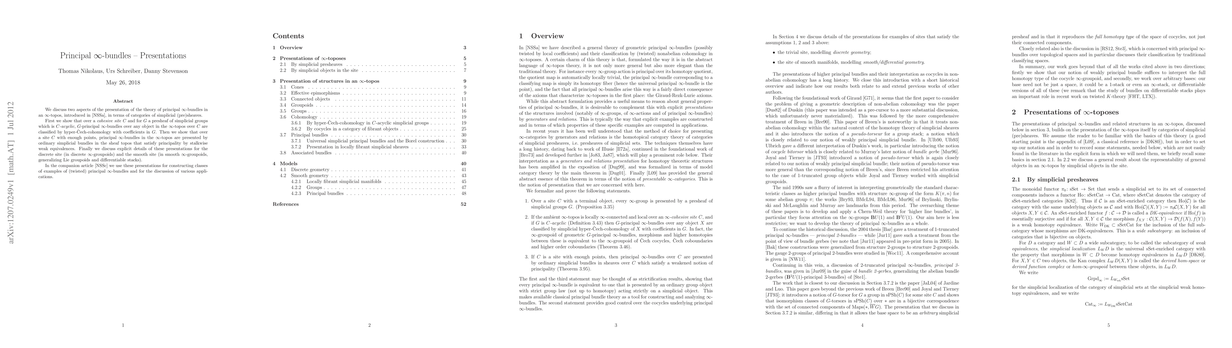 This paper explores the presentation of principal infinity-bundles within an infinity-topos using categories of simplicial (pre)sheaves. It demonstrates that these bundles over a cohesive site are classified by hyper-Cech-cohomology and can be represented by ordinary simplicial bundles satisfying principality via weak equivalences.