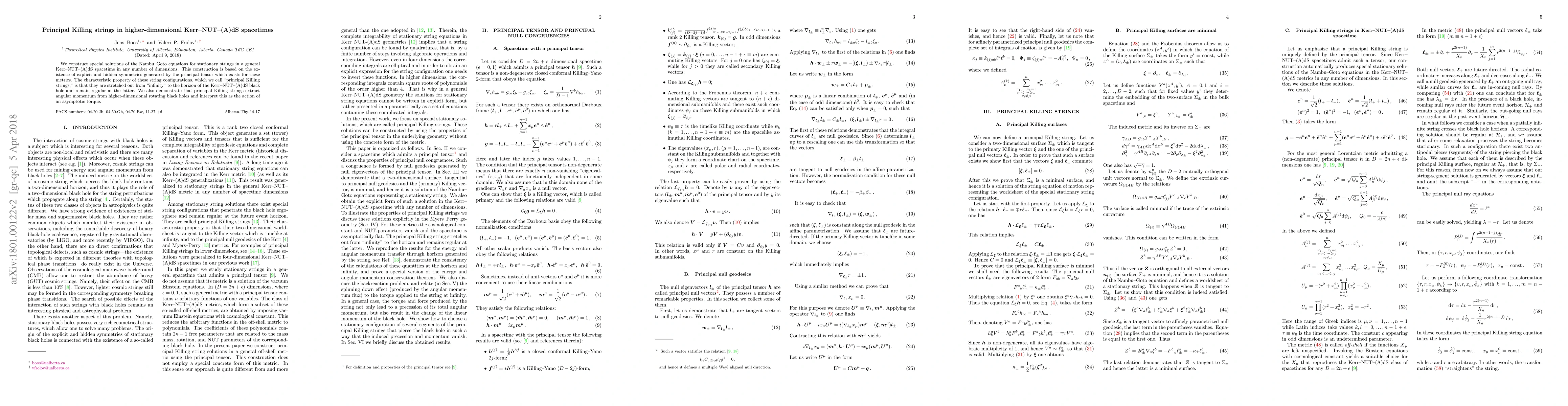 This paper constructs special "principal Killing strings" solutions for stationary strings in higher-dimensional Kerr-NUT-(A)dS spacetimes, utilizing explicit and hidden symmetries. These strings extend from infinity to the black hole horizon while remaining regular, and they extract angular momentum, acting as an asymptotic torque.