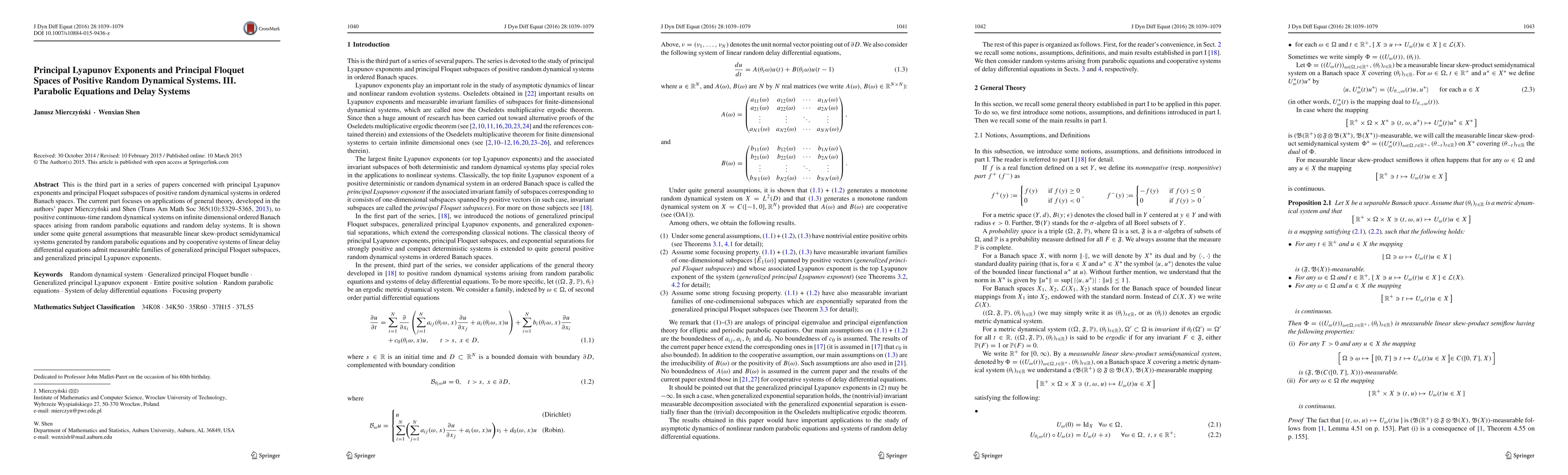This is the third part in a series of papers concerned with principal Lyapunov exponents and principal Floquet subspaces of positive random dynamical systems in ordered Banach spaces. The current part focuses on applications of general theory, developed in the authors' paper "Principal Lyapunov exponents and principal Floquet spaces of positive random dynamical systems. I. General theory," Trans. Amer. Math. Soc. 365 (2013), pp. 5329-5365, to positive continuous-time random dynamical systems on infinite dimensional ordered Banach spaces arising from random parabolic equations and random delay systems. It is shown under some quite general assumptions that measurable linear skew-product semidynamical systems generated by random parabolic equations and by cooperative systems of linear delay differential equations admit measurable families of generalized principal Floquet subspaces, and generalized principal Lyapunov exponents.