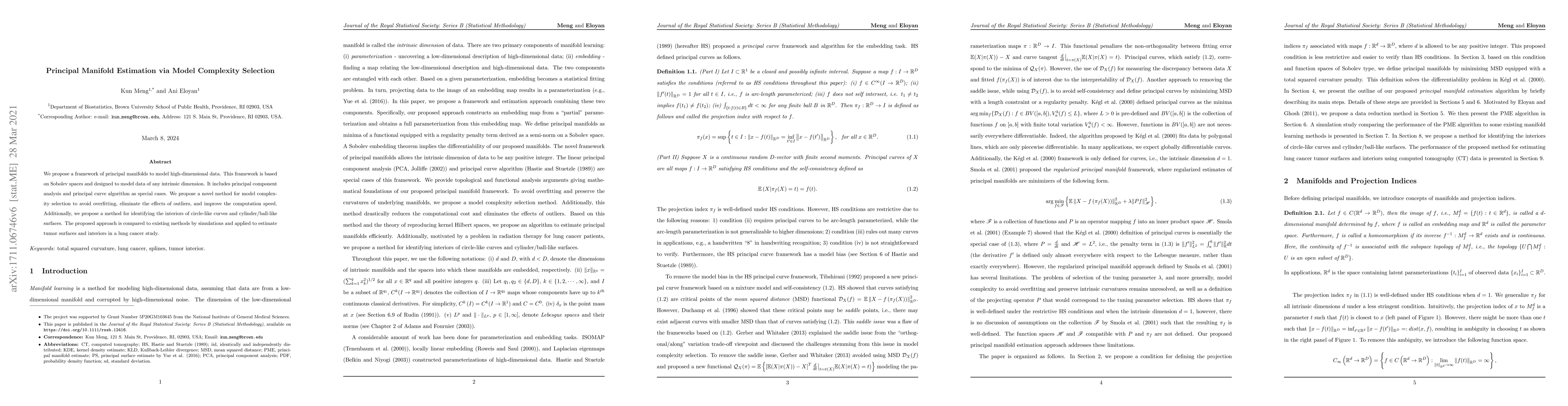 Researchers proposed a new framework for modeling high-dimensional data using principal manifolds, with a focus on avoiding overfitting and improving computational speed. The approach was tested in simulations and applied to estimate tumor surfaces in a lung cancer study.