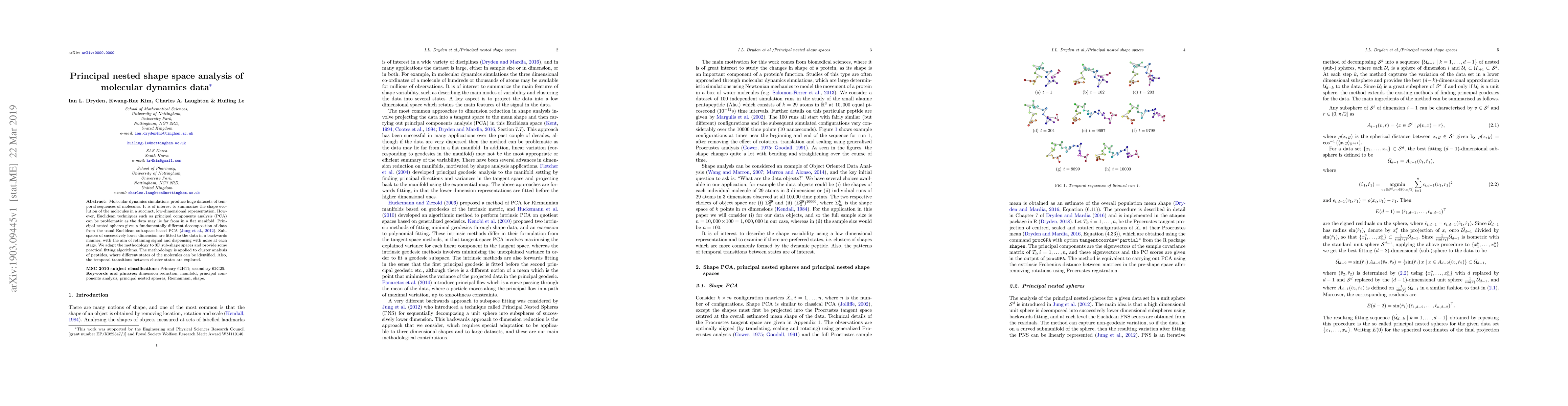 Molecular dynamics simulations produce huge datasets of temporal sequences of molecules. It is of interest to summarize the shape evolution of the molecules in a succinct, low-dimensional representation. However, Euclidean techniques such as principal components analysis (PCA) can be problematic as the data may lie far from in a flat manifold. Principal nested spheres gives a fundamentally different decomposition of data from the usual Euclidean sub-space based PCA (Jung, Dryden and Marron, 2012, Biometrika). Sub-spaces of successively lower dimension are fitted to the data in a backwards manner, with the aim of retaining signal and dispensing with noise at each stage. We adapt the methodology to 3D sub-shape spaces and provide some practical fitting algorithms. The methodology is applied to cluster analysis of peptides, where different states of the molecules can be identified. Also, the temporal transitions between cluster states are explored.