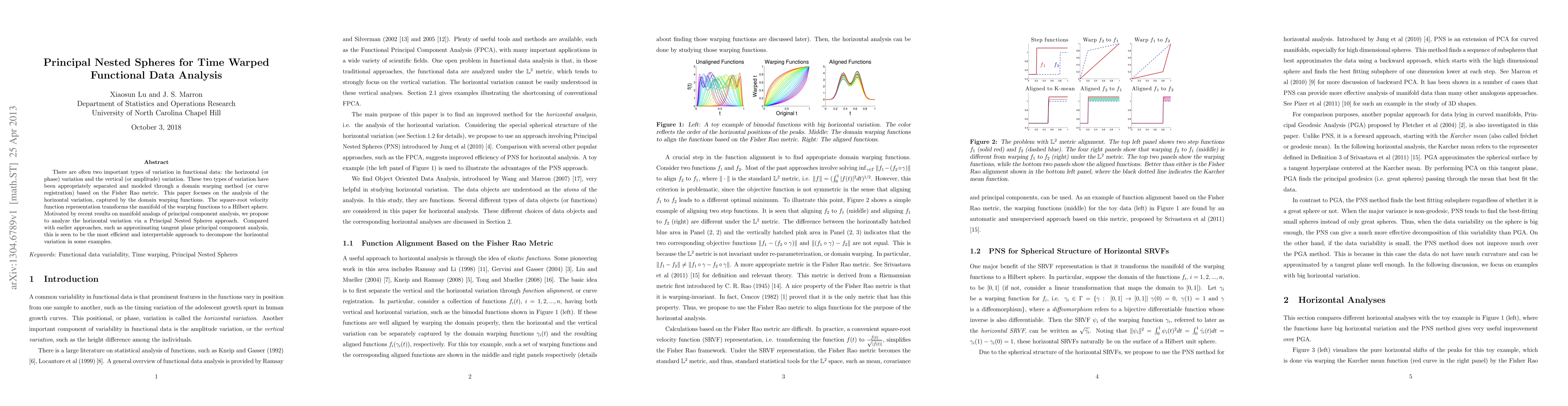 This paper proposes a Principal Nested Spheres approach for analyzing horizontal variation in time-warped functional data, transforming warping functions using a square-root velocity function to a Hilbert sphere. This method is shown to be more efficient and interpretable than previous tangent plane principal component analysis approximations.