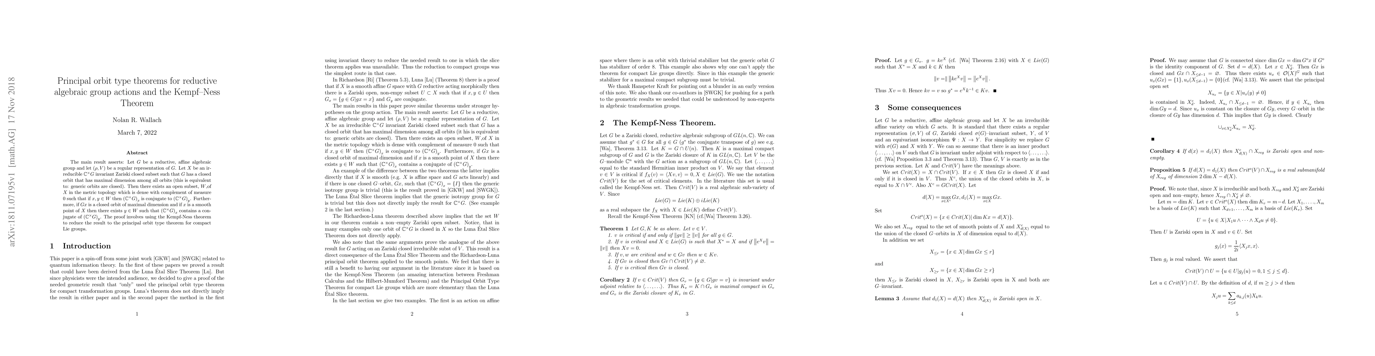 The main result asserts: Let $G$ be a reductive, affine algebraic group and let $(\rho ,V)$ be a regular representation of $G$. Let $X$ be an irreducible $\mathbb{C}^{ \times } G$ invariant Zariski closed subset such that $G$ has a closed orbit that has maximal dimension among all orbits (this is equivalent to: generic orbits are closed). Then there exists an open subset, $W$,of $X$ in the metric topology which is dense with complement of measure $0$ such that if $x ,y \in W$ then $\left (\mathbb{C}^{ \times } G\right )_{x}$ is conjugate to $\left (\mathbb{C}^{ \times } G\right )_{y}$. Furthermore, if $G x$ is a closed orbit of maximal dimension and if $x$ is a smooth point of $X$ then there exists $y \in W$ such that $\left (\mathbb{C}^{ \times } G\right )_{x}$ contains a conjugate of $\left (\mathbb{C}^{ \times } G\right )_{y}$. The proof involves using the Kempf-Ness theorem to reduce the result to the principal orbit type theorem for compact Lie groups.