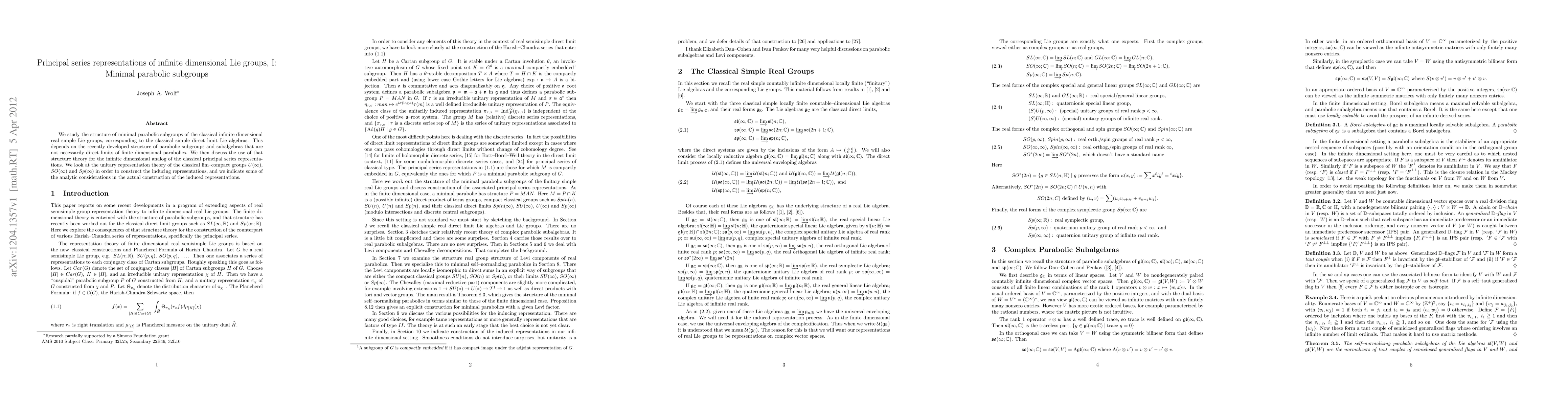 We study the structure of minimal parabolic subgroups of the classical infinite dimensional real simple Lie groups, corresponding to the classical simple direct limit Lie algebras. This depends on the recently developed structure of parabolic subgroups and subalgebras that are not necessarily direct limits of finite dimensional parabolics. We then discuss the use of that structure theory for the infinite dimensional analog of the classical principal series representations. We look at the unitary representation theory of the classical lim--compact groups $U(\infty)$, $SO(\infty)$ and $Sp(\infty)$ in order to construct the inducing representations, and we indicate some of the analytic considerations in the actual construction of the induced representations.