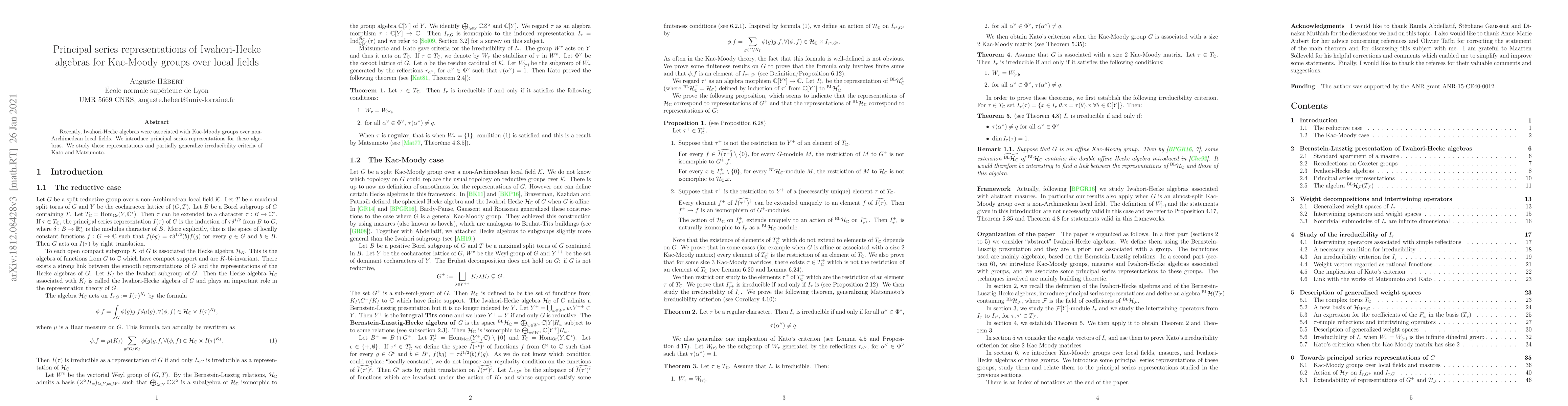 Recently, Iwahori-Hecke algebras were associated to Kac-Moody groups over non-Archimedean local fields. We introduce principal series representations for these algebras. We study these representations and partially generalize Kato and Matsumoto irreducibility criteria.