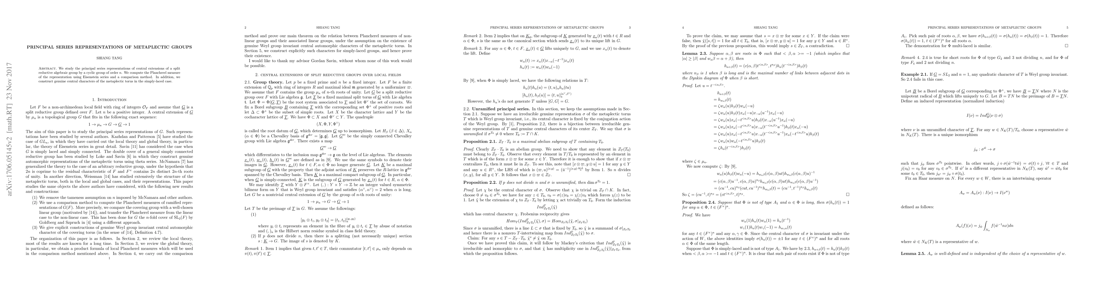 The paper studies principal series representations of central extensions of split reductive algebraic groups by a cyclic group of order n, computing the Plancherel measure using Eisenstein series and a comparison method. It also constructs genuine central characters of the metaplectic torus in the simply-laced case.