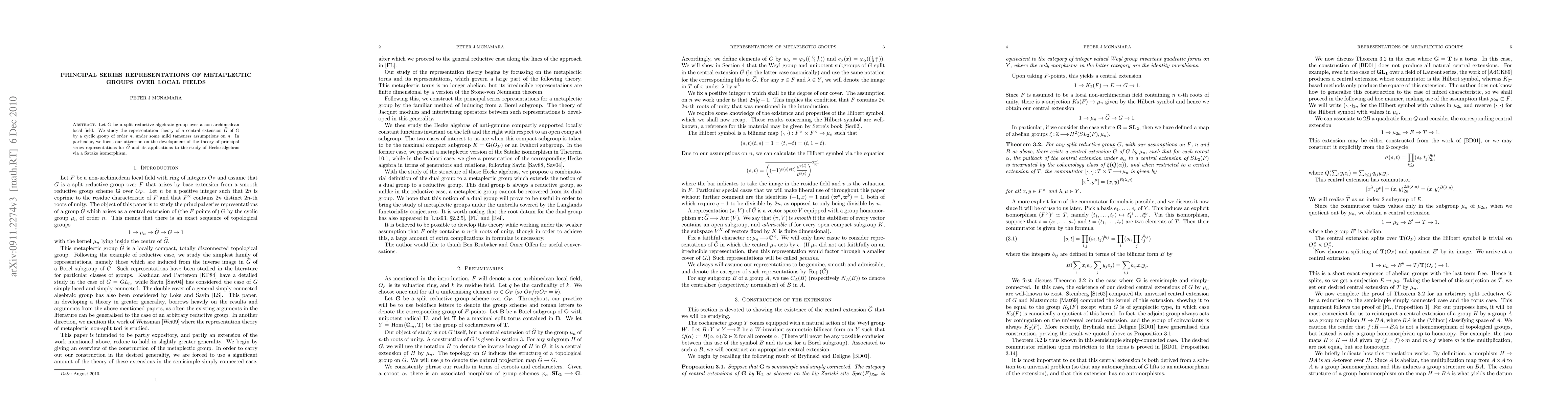 This paper studies the representation theory of metaplectic groups over local fields with a central extension by a cyclic group, focusing on principal series representations and their applications.