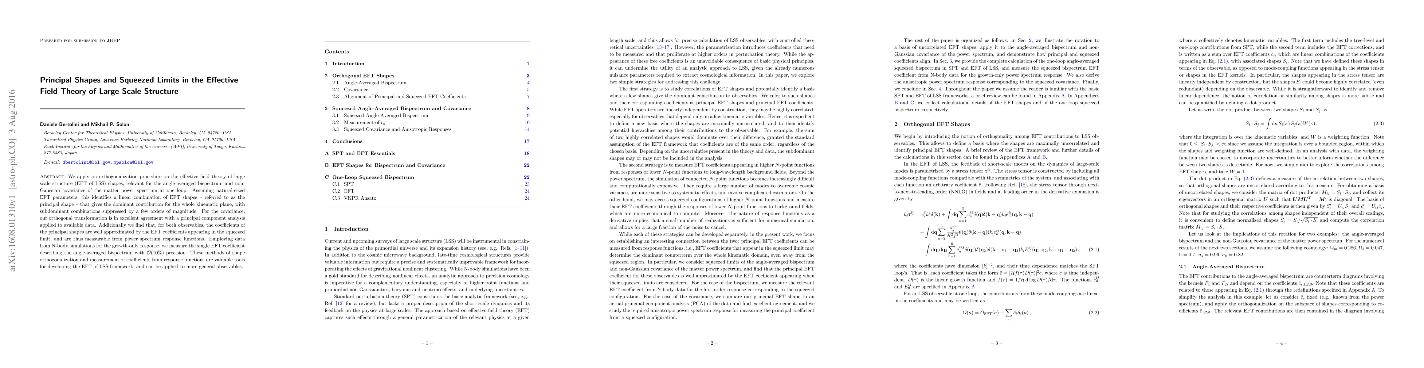 We apply an orthogonalization procedure on the effective field theory of large scale structure (EFT of LSS) shapes, relevant for the angle-averaged bispectrum and non-Gaussian covariance of the matter power spectrum at one loop. Assuming natural-sized EFT parameters, this identifies a linear combination of EFT shapes - referred to as the principal shape - that gives the dominant contribution for the whole kinematic plane, with subdominant combinations suppressed by a few orders of magnitude. For the covariance, our orthogonal transformation is in excellent agreement with a principal component analysis applied to available data. Additionally we find that, for both observables, the coefficients of the principal shapes are well approximated by the EFT coefficients appearing in the squeezed limit, and are thus measurable from power spectrum response functions. Employing data from N-body simulations for the growth-only response, we measure the single EFT coefficient describing the angle-averaged bispectrum with $\mathcal{O}(10\%)$ precision. These methods of shape orthogonalization and measurement of coefficients from response functions are valuable tools for developing the EFT of LSS framework, and can be applied to more general observables.