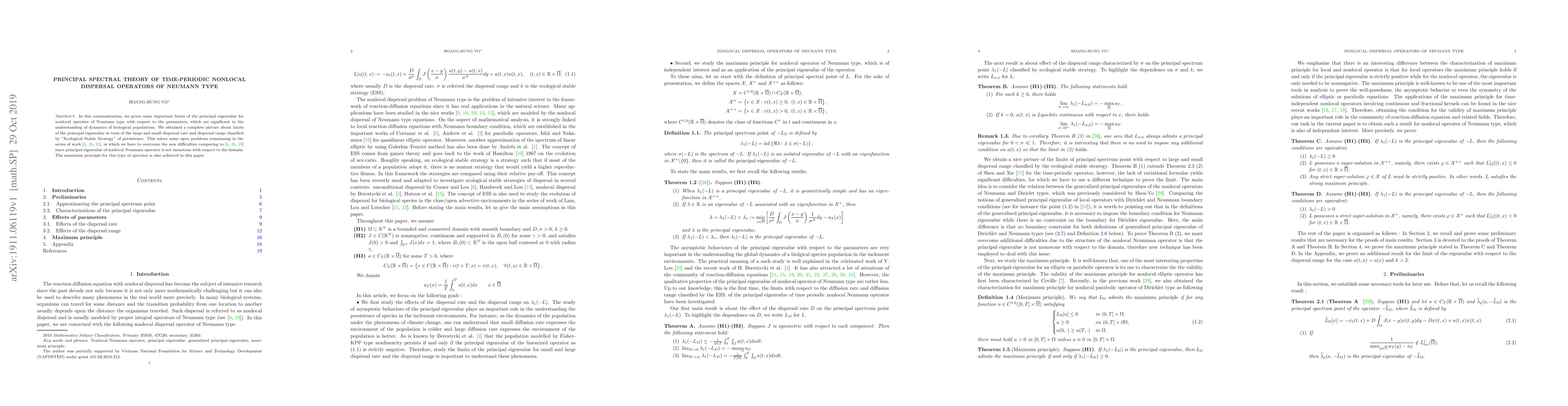 Researchers developed a principal spectral theory for nonlocal dispersal operators of Neumann type, providing new insights into the dynamics of biological populations and resolving open problems in the field. The study sheds light on the limits of the principal eigenvalue under different parameters, including large and small dispersal rates and ranges.