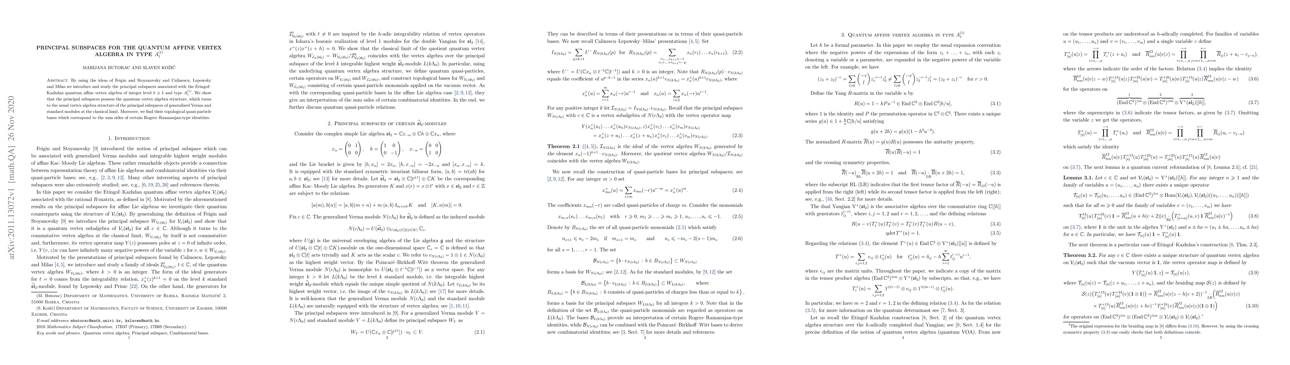 This paper introduces and studies principal subspaces within the quantum affine vertex algebra of type $A_1^{(1)}$, showing they retain a quantum vertex algebra structure that converges to classical vertex algebras at limits. It also identifies their topological quasi-particle bases linked to Rogers-Ramanujan-type identities.