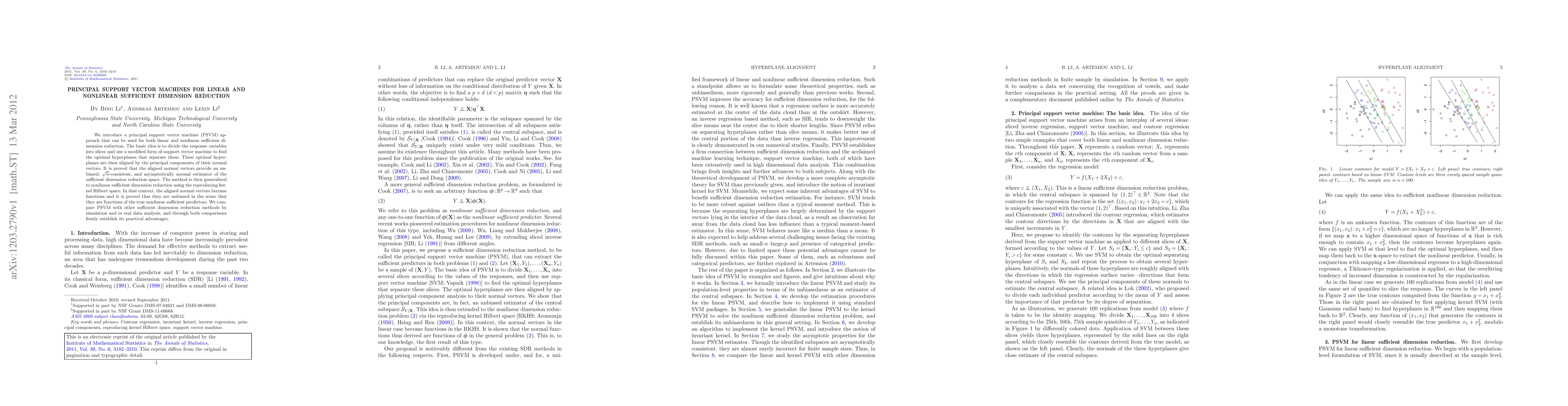 This paper introduces a principal support vector machine (PSVM) for both linear and nonlinear sufficient dimension reduction, proving its unbiasedness and consistency. The method uses optimal hyperplanes aligned by principal components and is shown to outperform other methods in simulations and real data analysis.