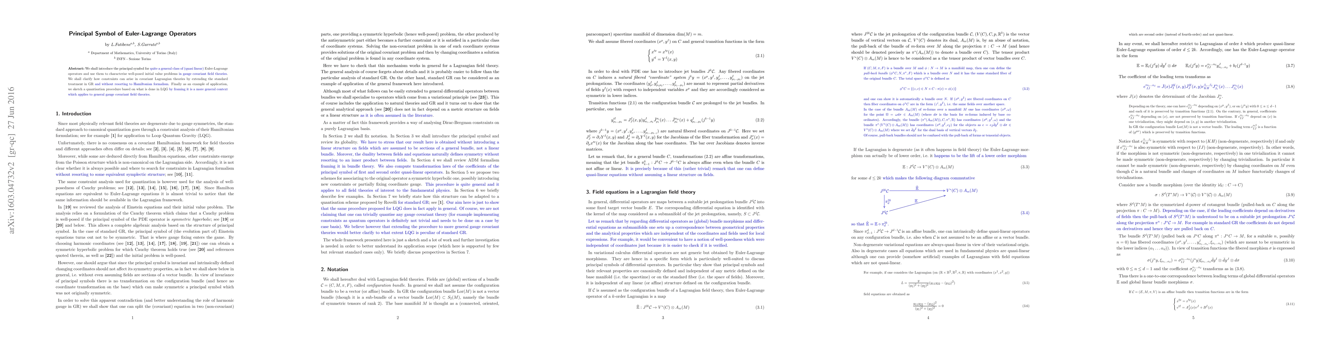 We shall introduce the principal symbol for Euler-Lagrange operators and use them to charac- terise well-posed initial value problems. We shall clarify how constraints can arise in Lagrangian covariant theories by extending the standard treatment in GR. Finally, we sketch a quantization procedure based on what done in LQG.