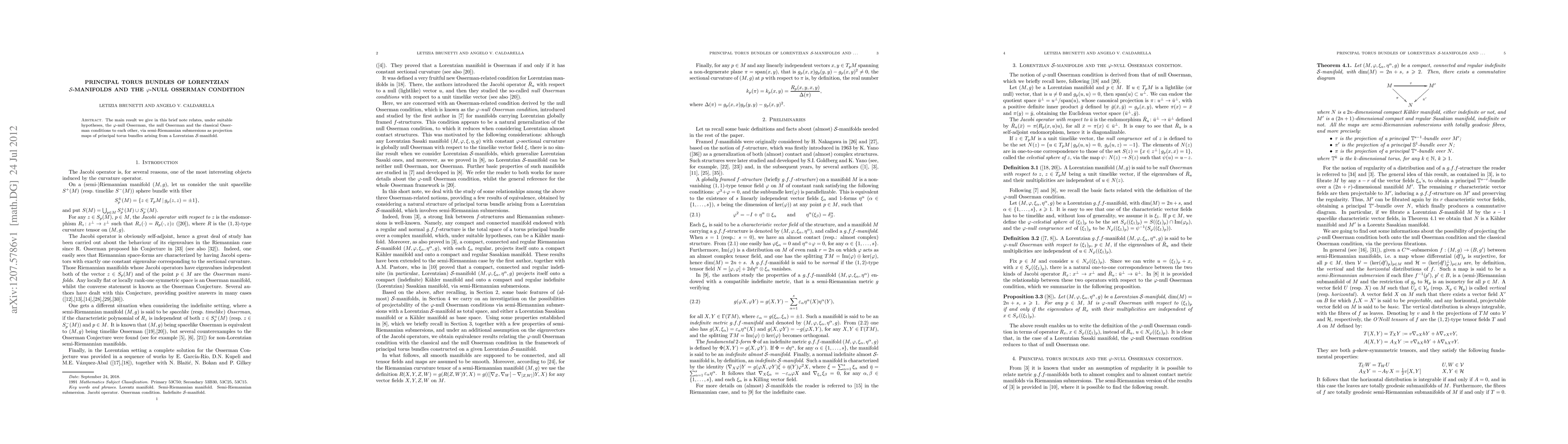 The main result we give in this brief note relates, under suitable hypotheses, the {\phi}-null Osserman, the null Osserman and the classical Osserman conditions to each other, via semi-Riemannian submersions as projection maps of principal torus bundles arising from a Lorentzian S-manifold.