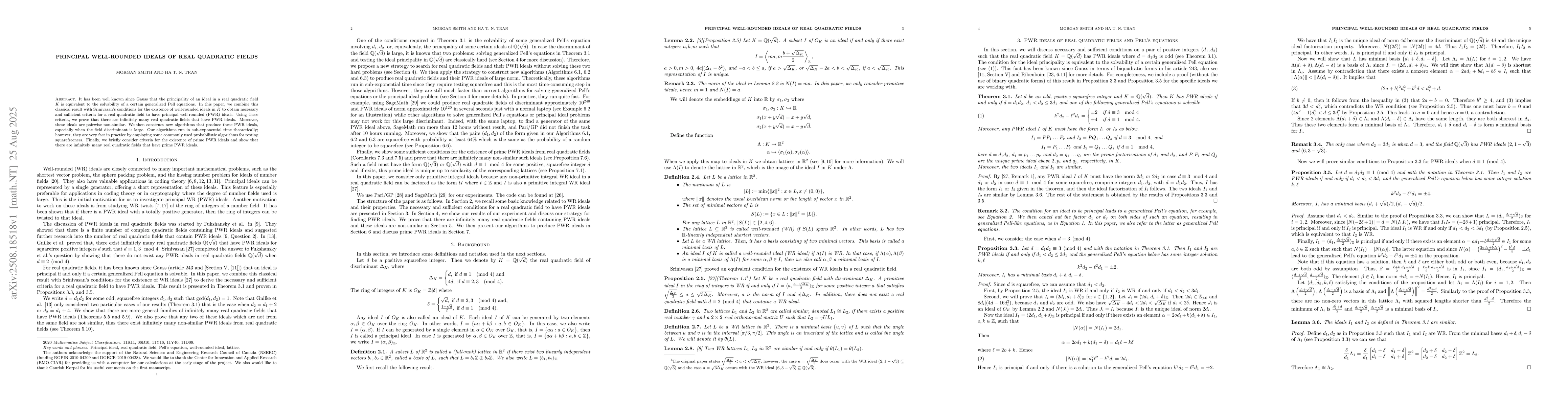 It has been well known since Gauss that the principality of an ideal in a real quadratic field $K$ is equivalent to the solvability of a certain generalized Pell equations. In this paper, we combine this classical result with Srinivasan's conditions for the existence of well-rounded ideals in $K$ to obtain necessary and sufficient criteria for a real quadratic field to have principal well-rounded (PWR) ideals. Using these criteria, we prove that there are infinitely many real quadratic fields that have PWR ideals. Moreover, these ideals are pairwise non-similar. We then construct new algorithms that produce these PWR ideals, especially when the field discriminant is large. Our algorithms run in sub-exponential time theoretically; however, they are very fast in practice by employing some commonly used probabilistic algorithms for testing squarefreeness. Finally, we briefly consider criteria for the existence of prime PWR ideals and show that there are infinitely many real quadratic fields that have prime PWR ideals.