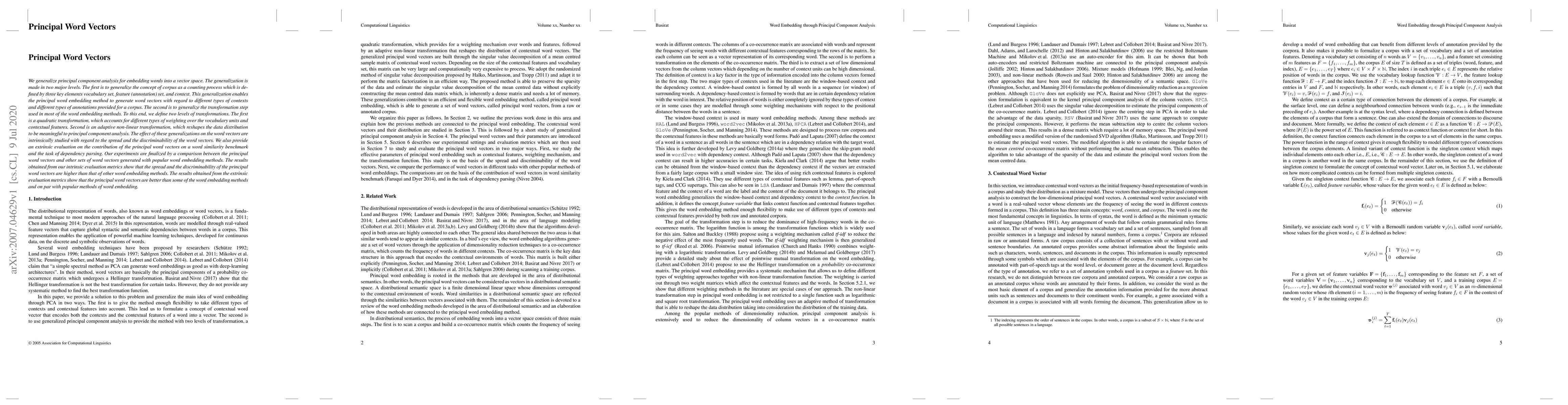 We generalize principal component analysis for embedding words into a vector space. The generalization is made in two major levels. The first is to generalize the concept of the corpus as a counting process which is defined by three key elements vocabulary set, feature (annotation) set, and context. This generalization enables the principal word embedding method to generate word vectors with regard to different types of contexts and different types of annotations provided for a corpus. The second is to generalize the transformation step used in most of the word embedding methods. To this end, we define two levels of transformations. The first is a quadratic transformation, which accounts for different types of weighting over the vocabulary units and contextual features. Second is an adaptive non-linear transformation, which reshapes the data distribution to be meaningful to principal component analysis. The effect of these generalizations on the word vectors is intrinsically studied with regard to the spread and the discriminability of the word vectors. We also provide an extrinsic evaluation of the contribution of the principal word vectors on a word similarity benchmark and the task of dependency parsing. Our experiments are finalized by a comparison between the principal word vectors and other sets of word vectors generated with popular word embedding methods. The results obtained from our intrinsic evaluation metrics show that the spread and the discriminability of the principal word vectors are higher than that of other word embedding methods. The results obtained from the extrinsic evaluation metrics show that the principal word vectors are better than some of the word embedding methods and on par with popular methods of word embedding.