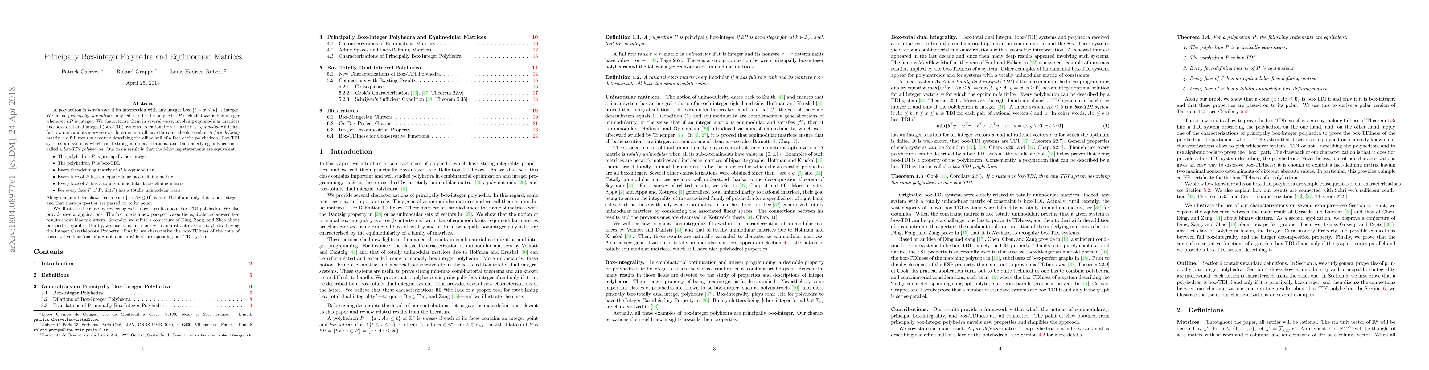 A polyhedron is box-integer if its intersection with any integer box $\{\ell\leq x \leq u\}$ is integer. We define principally box-integer polyhedra to be the polyhedra $P$ such that $kP$ is box-integer whenever $kP$ is integer. We characterize them in several ways, involving equimodular matrices and box-total dual integral (box-TDI) systems. A rational $r\times n$ matrix is equimodular if it has full row rank and its nonzero $r\times r$ determinants all have the same absolute value. A face-defining matrix is a full row rank matrix describing the affine hull of a face of the polyhedron. Box-TDI systems are systems which yield strong min-max relations, and the underlying polyhedron is called a box-TDI polyhedron. Our main result is that the following statements are equivalent. - The polyhedron $P$ is principally box-integer. - The polyhedron $P$ is box-TDI. - Every face-defining matrix of $P$ is equimodular. - Every face of $P$ has an equimodular face-defining matrix. - Every face of $P$ has a totally unimodular face-defining matrix. - For every face $F$ of $P$, lin($F$) has a totally unimodular basis. Along our proof, we show that a cone $\{x:Ax\leq \mathbf{0}\}$ is box-TDI if and only if it is box-integer, and that these properties are passed on to its polar. We illustrate the use of these characterizations by reviewing well known results about box-TDI polyhedra. We also provide several applications. The first one is a new perspective on the equivalence between two results about binary clutters. Secondly, we refute a conjecture of Ding, Zang, and Zhao about box-perfect graphs. Thirdly, we discuss connections with an abstract class of polyhedra having the Integer Carath\'eodory Property. Finally, we characterize the box-TDIness of the cone of conservative functions of a graph and provide a corresponding box-TDI system.