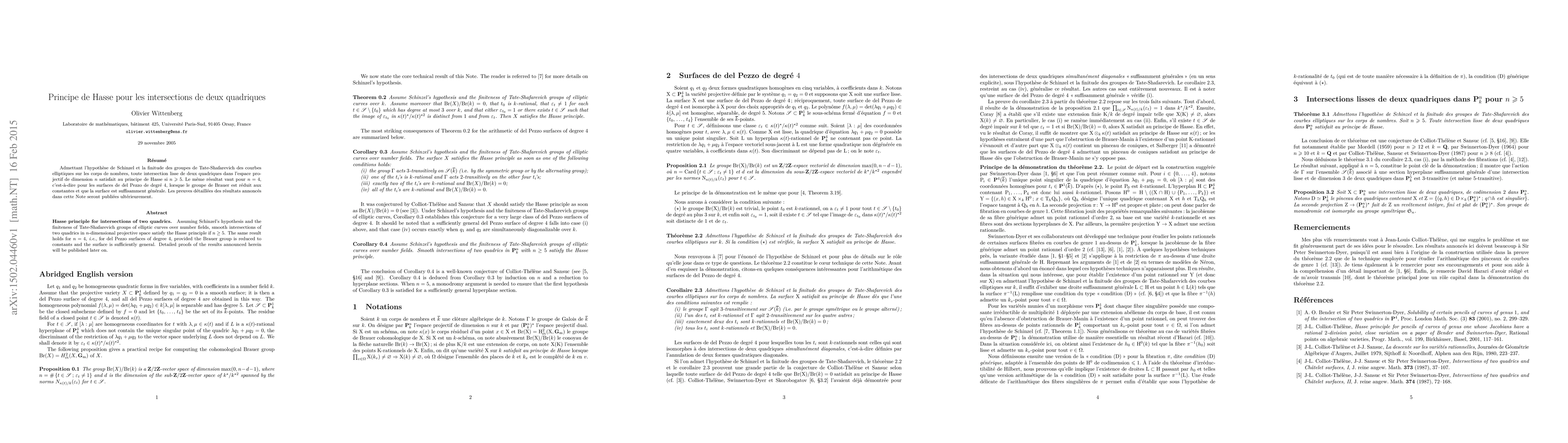 Admettant l'hypoth\`ese de Schinzel et la finitude des groupes de Tate-Shafarevich des courbes elliptiques sur les corps de nombres, toute intersection lisse de deux quadriques dans l'espace projectif de dimension n satisfait au principe de Hasse si n>4. Le m\^eme r\'esultat vaut pour n=4, c'est-\`a-dire pour les surfaces de del Pezzo de degr\'e 4, lorsque le groupe de Brauer est r\'eduit aux constantes et que la surface est suffisamment g\'en\'erale. ----- Assuming Schinzel's hypothesis and the finiteness of Tate-Shafarevich groups of elliptic curves over number fields, smooth intersections of two quadrics in n-dimensional projective space satisfy the Hasse principle if n>4. The same result holds for n=4, i.e., for del Pezzo surfaces of degree 4, provided the Brauer group is reduced to constants and the surface is sufficiently general.