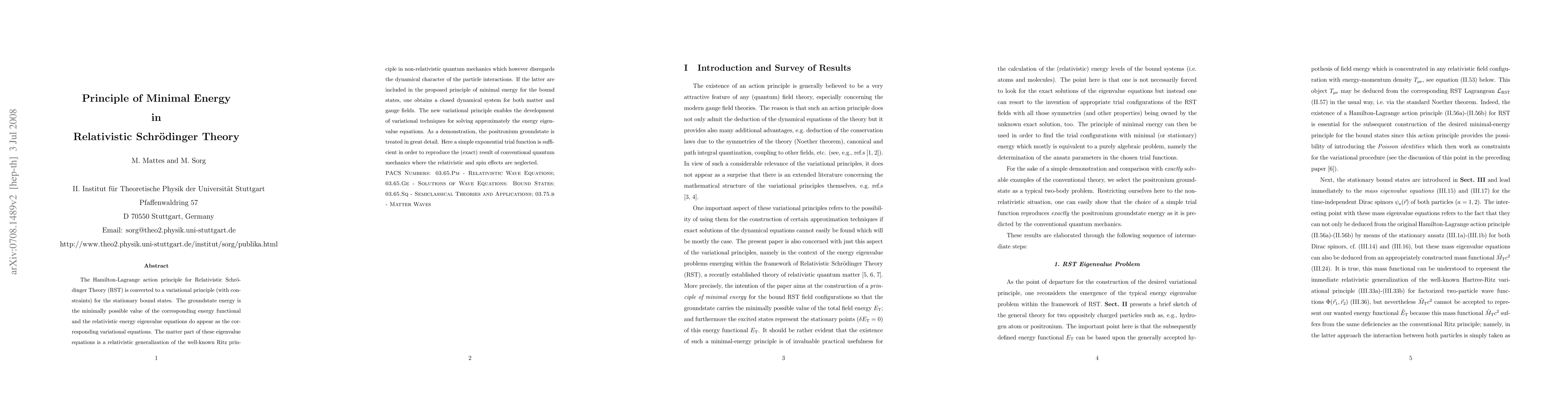 The Hamilton-Lagrange action principle for Relativistic Schr\"odinger Theory (RST) is converted to a variational principle (with constraints) for the stationary bound states. The groundstate energy is the minimally possible value of the corresponding energy functional and the relativistic energy eigenvalue equations do appear as the corresponding variational equations. The matter part of these eigenvalue equations is a relativistic generalization of the well-known Ritz principle in non-relativistic quantum mechanics which however disregards the dynamical character of the particle interactions. If the latter are included in the proposed principle of minimal energy for the bound states, one obtains a closed dynamical system for both matter and gauge fields. The new variational principle enables the development of variational techniques for solving approximately the energy eigenvalue equations. As a demonstration, the positronium groundstate is treated in great detail. Here a simple exponential trial function is sufficient in order to reproduce the (exact) result of conventional quantum mechanics where the relativistic and spin effects are neglected.