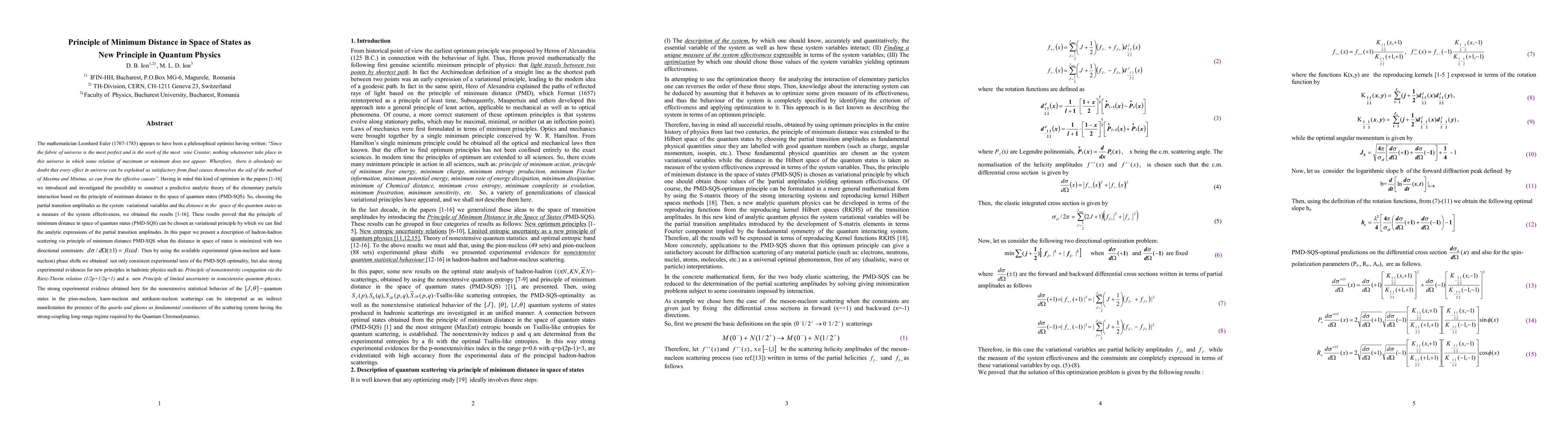 The mathematician Leonhard Euler (1707-1783) appears to have been a philosophical optimist having written: "Since the fabric of universe is the most perfect and is the work of the most wise Creator, nothing whatsoever take place in this universe in which some relation of maximum or minimum does not appear. Wherefore, there is absolutely no doubt that every effect in universe can be explained as satisfactory from final causes themselves the aid of the method of Maxima and Minima, as can from the effective causes". Having in mind this kind of optimism, in the papers [1-16] we introduced and investigated the possibility to construct a predictive analytic theory of the elementary particle interaction based on the principle of minimum distance in the space of quantum states (PMD-SQS). So, choosing the partial transition amplitudes as the system variational variables and the distance in the space of the quantum states as a measure of the system effectiveness, we obtained the results [1-16]. These results proved that the principle of minimum distance in space of quantum states (PMD-SQS) can be chosen as variational principle by which we can find the analytic expressions of the partial transition amplitudes. In this paper we present a description of hadron-hadron scattering via principle of minimum distance PMD-SQS when the distance in space of states is minimized with two directional constraints. Then by using the available experimental (pion-nucleon and kaon-nucleon) phase shifts we obtained not only consistent experimental tests of the PMD-SQS optimality, but also strong experimental evidences for new principles in hadronic physics such as: Principle of nonextensivity conjugation via the Riesz-Thorin relation (1/2p+1/2q=1) and a new Principle of limited uncertainty in nonextensive quantum physics.