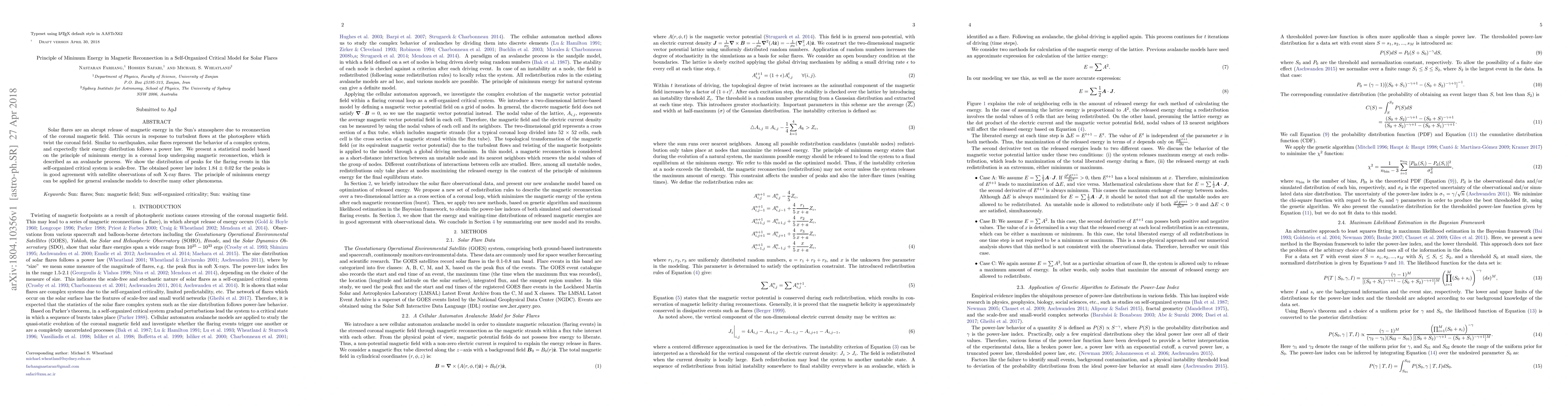 This paper proposes a statistical model based on the principle of minimum energy for magnetic reconnection in solar flares, demonstrating that the distribution of flare peaks follows a power law, consistent with observations. The model's self-organized critical behavior and derived power law index align well with satellite data, suggesting its applicability to other avalanche phenomena.