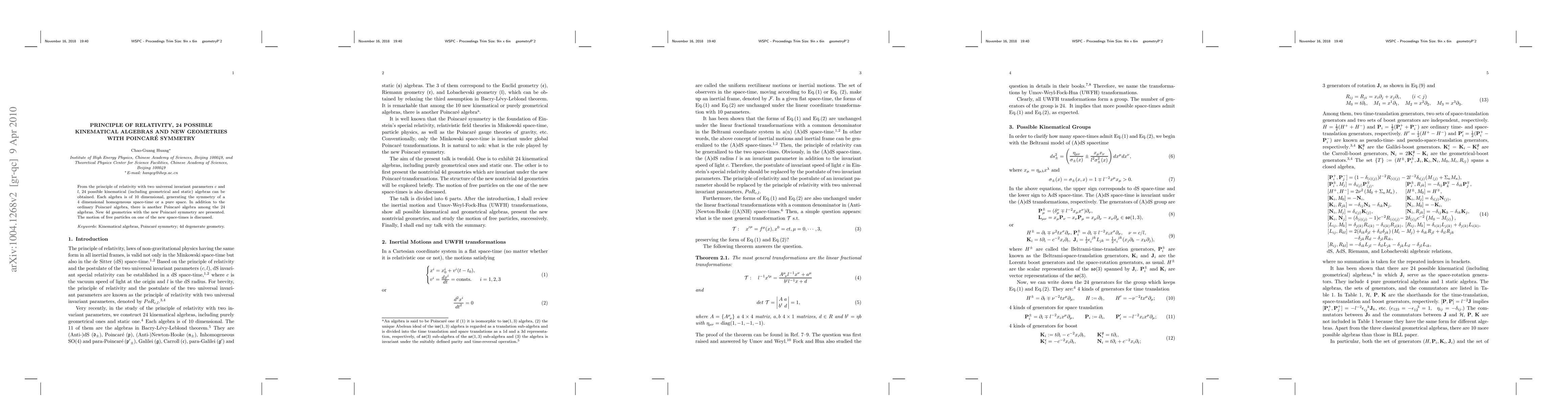 This paper explores 24 possible kinematical algebras derived from the principle of relativity, featuring two invariant parameters. It introduces new 4-dimensional geometries with a distinct Poincar\'e symmetry and discusses the motion of free particles within one of these novel space-times.