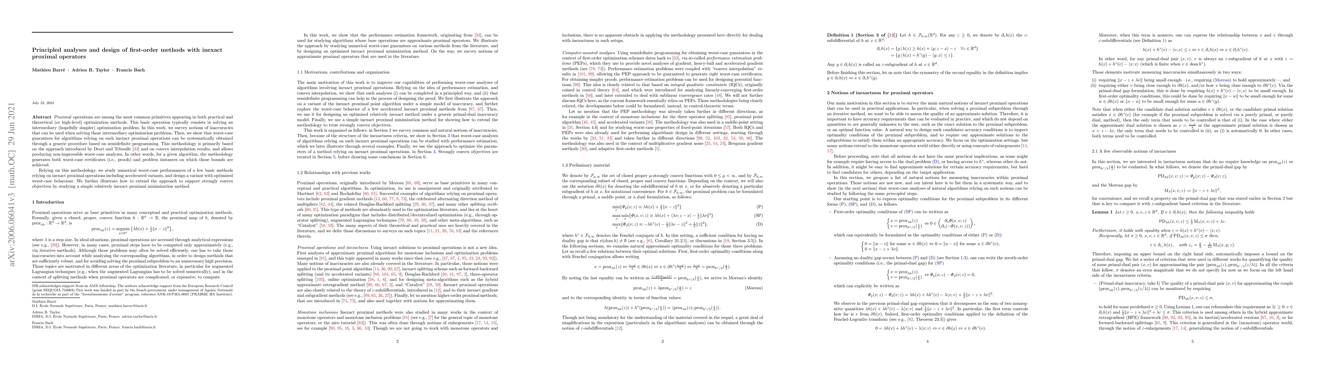 Proximal operations are among the most common primitives appearing in both practical and theoretical (or high-level) optimization methods. This basic operation typically consists in solving an intermediary (hopefully simpler) optimization problem. In this work, we survey notions of inaccuracies that can be used when solving those intermediary optimization problems. Then, we show that worst-case guarantees for algorithms relying on such inexact proximal operations can be systematically obtained through a generic procedure based on semidefinite programming. This methodology is primarily based on the approach introduced by Drori and Teboulle (2014) and on convex interpolation results, and allows producing non-improvable worst-case analyzes. In other words, for a given algorithm, the methodology generates both worst-case certificates (i.e., proofs) and problem instances on which those bounds are achieved. Relying on this methodology, we study numerical worst-case performances of a few basic methods relying on inexact proximal operations including accelerated variants, and design a variant with optimized worst-case behaviour. We further illustrate how to extend the approach to support strongly convex objectives by studying a simple relatively inexact proximal minimization method.