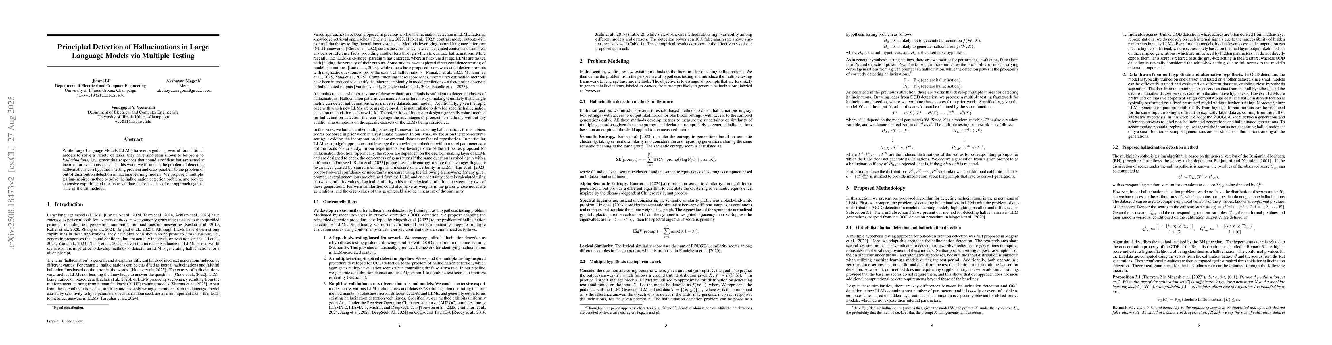While Large Language Models (LLMs) have emerged as powerful foundational models to solve a variety of tasks, they have also been shown to be prone to hallucinations, i.e., generating responses that sound confident but are actually incorrect or even nonsensical. In this work, we formulate the problem of detecting hallucinations as a hypothesis testing problem and draw parallels to the problem of out-of-distribution detection in machine learning models. We propose a multiple-testing-inspired method to solve the hallucination detection problem, and provide extensive experimental results to validate the robustness of our approach against state-of-the-art methods.