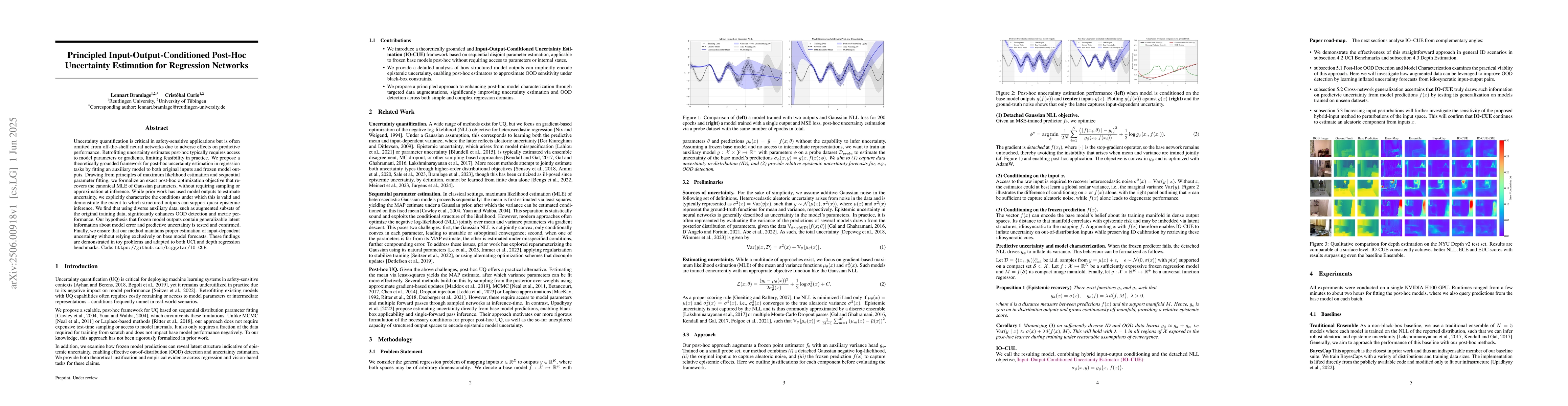 Uncertainty quantification is critical in safety-sensitive applications but is often omitted from off-the-shelf neural networks due to adverse effects on predictive performance. Retrofitting uncertainty estimates post-hoc typically requires access to model parameters or gradients, limiting feasibility in practice. We propose a theoretically grounded framework for post-hoc uncertainty estimation in regression tasks by fitting an auxiliary model to both original inputs and frozen model outputs. Drawing from principles of maximum likelihood estimation and sequential parameter fitting, we formalize an exact post-hoc optimization objective that recovers the canonical MLE of Gaussian parameters, without requiring sampling or approximation at inference. While prior work has used model outputs to estimate uncertainty, we explicitly characterize the conditions under which this is valid and demonstrate the extent to which structured outputs can support quasi-epistemic inference. We find that using diverse auxiliary data, such as augmented subsets of the original training data, significantly enhances OOD detection and metric performance. Our hypothesis that frozen model outputs contain generalizable latent information about model error and predictive uncertainty is tested and confirmed. Finally, we ensure that our method maintains proper estimation of input-dependent uncertainty without relying exclusively on base model forecasts. These findings are demonstrated in toy problems and adapted to both UCI and depth regression benchmarks. Code: https://github.com/biggzlar/IO-CUE.