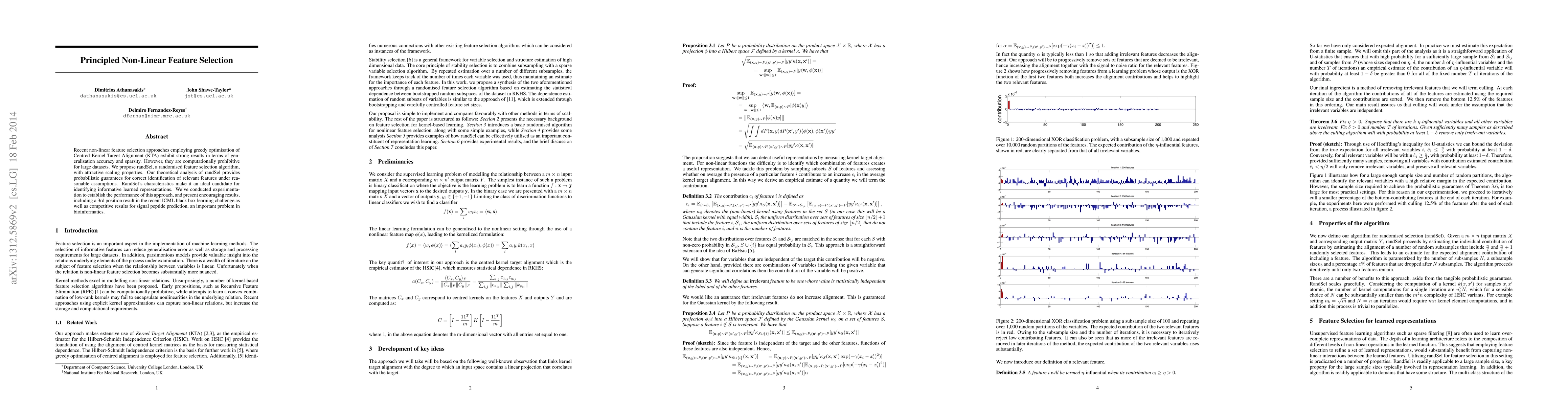 Recent non-linear feature selection approaches employing greedy optimisation of Centred Kernel Target Alignment(KTA) exhibit strong results in terms of generalisation accuracy and sparsity. However, they are computationally prohibitive for large datasets. We propose randSel, a randomised feature selection algorithm, with attractive scaling properties. Our theoretical analysis of randSel provides strong probabilistic guarantees for correct identification of relevant features. RandSel's characteristics make it an ideal candidate for identifying informative learned representations. We've conducted experimentation to establish the performance of this approach, and present encouraging results, including a 3rd position result in the recent ICML black box learning challenge as well as competitive results for signal peptide prediction, an important problem in bioinformatics.