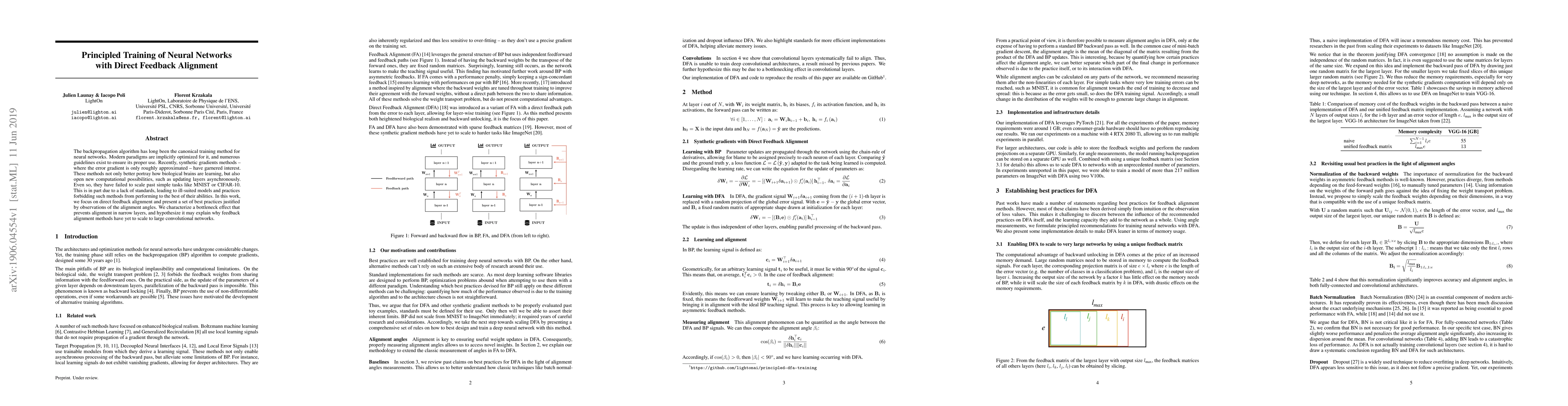 This paper introduces best practices for training neural networks using direct feedback alignment, a synthetic gradient method. It identifies a bottleneck effect in narrow layers that hinders alignment, suggesting this may limit the scalability of feedback alignment to large convolutional networks.