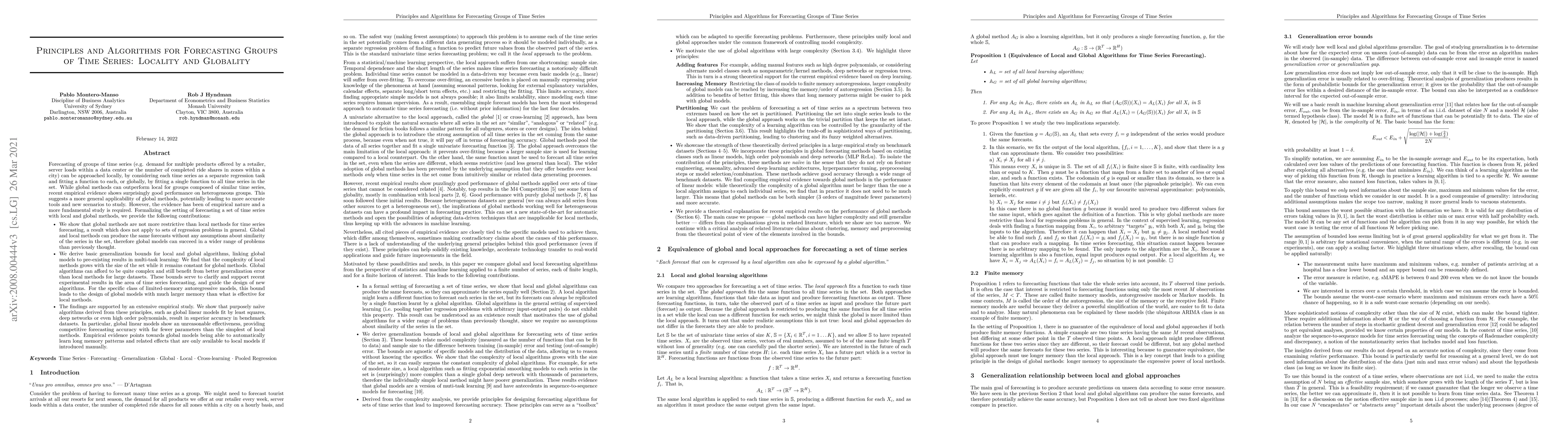 Forecasting groups of time series is of increasing practical importance, e.g. forecasting the demand for multiple products offered by a retailer or server loads within a data center. The local approach to this problem considers each time series separately and fits a function or model to each series. The global approach fits a single function to all series. For groups of similar time series, global methods outperform the more established local methods. However, recent results show good performance of global models even in heterogeneous datasets. This suggests a more general applicability of global methods, potentially leading to more accurate tools and new scenarios to study. Formalizing the setting of forecasting a set of time series with local and global methods, we provide the following contributions: 1) Global methods are not more restrictive than local methods, both can produce the same forecasts without any assumptions about similarity of the series. Global models can succeed in a wider range of problems than previously thought. 2) Basic generalization bounds for local and global algorithms. The complexity of local methods grows with the size of the set while it remains constant for global methods. In large datasets, a global algorithm can afford to be quite complex and still benefit from better generalization. These bounds serve to clarify and support recent experimental results in the field, and guide the design of new algorithms. For the class of autoregressive models, this implies that global models can have much larger memory than local methods. 3) In an extensive empirical study, purposely naive algorithms derived from these principles, such as global linear models or deep networks result in superior accuracy. In particular, global linear models can provide competitive accuracy with two orders of magnitude fewer parameters than local methods.