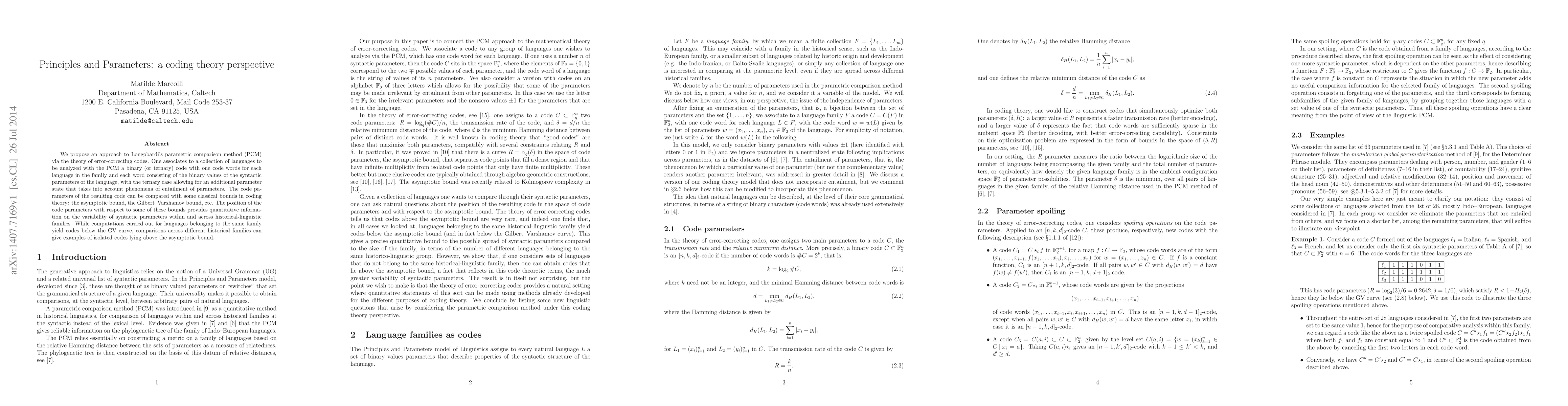 We propose an approach to Longobardi's parametric comparison method (PCM) via the theory of error-correcting codes. One associates to a collection of languages to be analyzed with the PCM a binary (or ternary) code with one code words for each language in the family and each word consisting of the binary values of the syntactic parameters of the language, with the ternary case allowing for an additional parameter state that takes into account phenomena of entailment of parameters. The code parameters of the resulting code can be compared with some classical bounds in coding theory: the asymptotic bound, the Gilbert-Varshamov bound, etc. The position of the code parameters with respect to some of these bounds provides quantitative information on the variability of syntactic parameters within and across historical-linguistic families. While computations carried out for languages belonging to the same family yield codes below the GV curve, comparisons across different historical families can give examples of isolated codes lying above the asymptotic bound.
