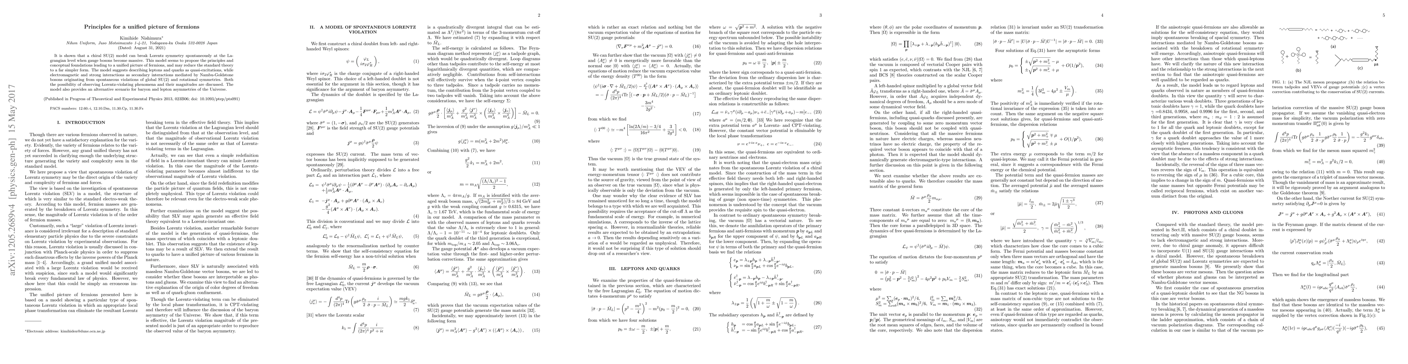 It is shown that a chiral SU(2) model can break Lorentz symmetry spontaneously at the Lagrangian level when gauge bosons become massive. This model seems to propose the principles and conceptual foundations leading to a unified picture of fermions, and may reduce the standard theory to a far simpler form. The model suggests describing leptons and quarks as quasi-excitations, while electromagnetic and strong interactions as secondary interactions mediated by Nambu-Goldstone bosons originating from spontaneous violations of global SU(2) and rotational symmetries. Both the possibility of observing Lorentz-violating phenomena and their magnitudes are discussed. The model also provides an alternative scenario for baryon and lepton asymmetries of the Universe.