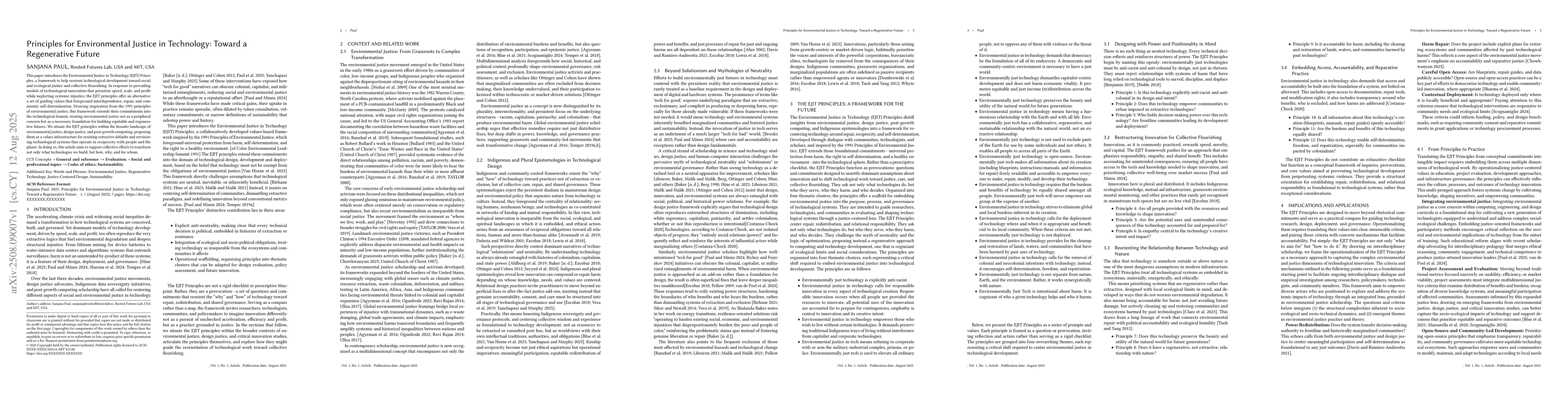 This paper introduces the Environmental Justice in Technology (EJIT) Principles, a framework to help reorient technological development toward social and ecological justice and collective flourishing. In response to prevailing models of technological innovation that prioritize speed, scale, and profit while neglecting systemic injustice, the EJIT principles offer an alternative: a set of guiding values that foreground interdependence, repair, and community self-determination. Drawing inspiration from the 1991 principles of environmental justice, this framework extends their commitments into the technological domain, treating environmental justice not as a peripheral concern but as a necessary foundation for building equitable and regenerative futures. We situate the EJIT principles within the broader landscape of environmental justice, design justice, and post-growth computing, proposing them as a values infrastructure for resisting extractive defaults and envisioning technological systems that operate in reciprocity with people and the planet. In doing so, this article aims to support collective efforts to transform not only what technologies we build, but how, why, and for whom.
