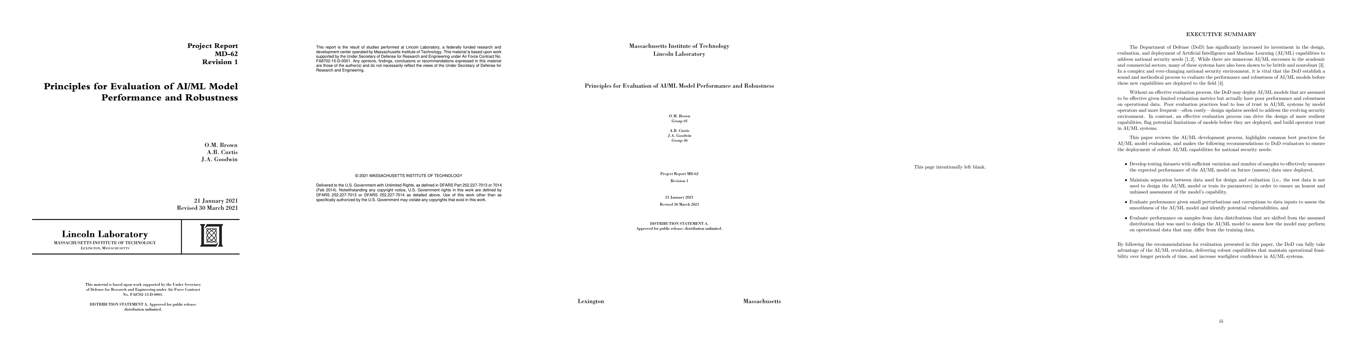 The Department of Defense (DoD) has significantly increased its investment in the design, evaluation, and deployment of Artificial Intelligence and Machine Learning (AI/ML) capabilities to address national security needs. While there are numerous AI/ML successes in the academic and commercial sectors, many of these systems have also been shown to be brittle and nonrobust. In a complex and ever-changing national security environment, it is vital that the DoD establish a sound and methodical process to evaluate the performance and robustness of AI/ML models before these new capabilities are deployed to the field. This paper reviews the AI/ML development process, highlights common best practices for AI/ML model evaluation, and makes recommendations to DoD evaluators to ensure the deployment of robust AI/ML capabilities for national security needs.