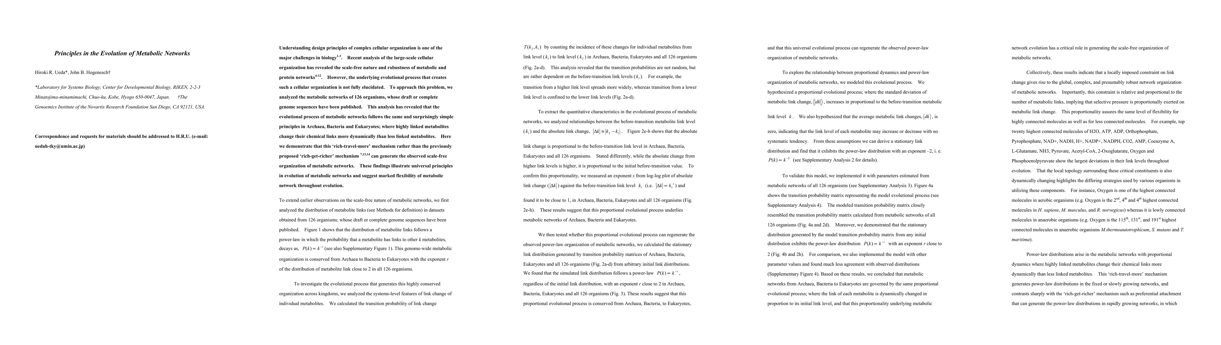 Understanding design principles of complex cellular organization is one of the major challenges in biology. Recent analysis of the large-scale cellular organization has revealed the scale-free nature and robustness of metabolic and protein networks. However, the underlying evolutional process that creates such a cellular organization is not fully elucidated. To approach this problem, we analyzed the metabolic networks of 126 organisms, whose draft or complete genome sequences have been published. This analysis has revealed that the evolutional process of metabolic networks follows the same and surprisingly simple principles in Archaea, Bacteria and Eukaryotes; where highly linked metabolites change their chemical links more dynamically than less linked metabolites. Here we demonstrate that this rich-travel-more mechanism rather than the previously proposed rich-get-richer mechanism can generate the observed scale-free organization of metabolic networks. These findings illustrate universal principles in evolution of metabolic networks and suggest marked flexibility of metabolic network throughout evolution.