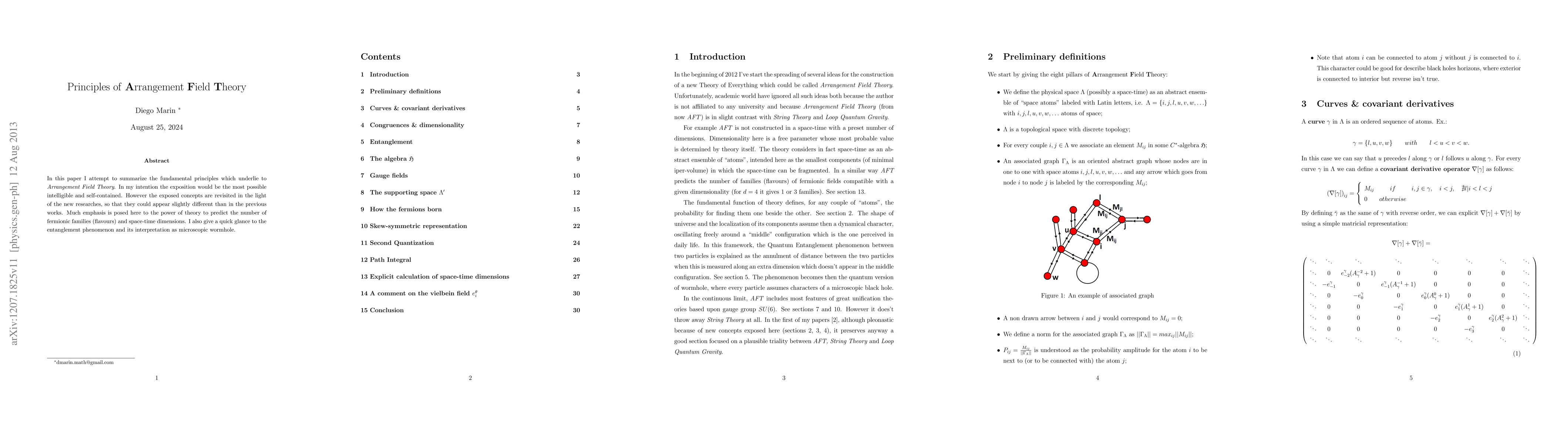 In this paper I attempt to summarize the fundamental principles which underlie to Arrangement Field Theory. In my intention the exposition would be the most possible intelligible and self-contained. However the exposed concepts are revisited in the light of the new researches, so that they could appear slightly different than in the previous works. Much emphasis is posed here to the power of theory to predict the number of fermionic families (flavours) and space-time dimensions. I also give a quick glance to the entanglement phenomenon and its interpretation as microscopic wormhole.