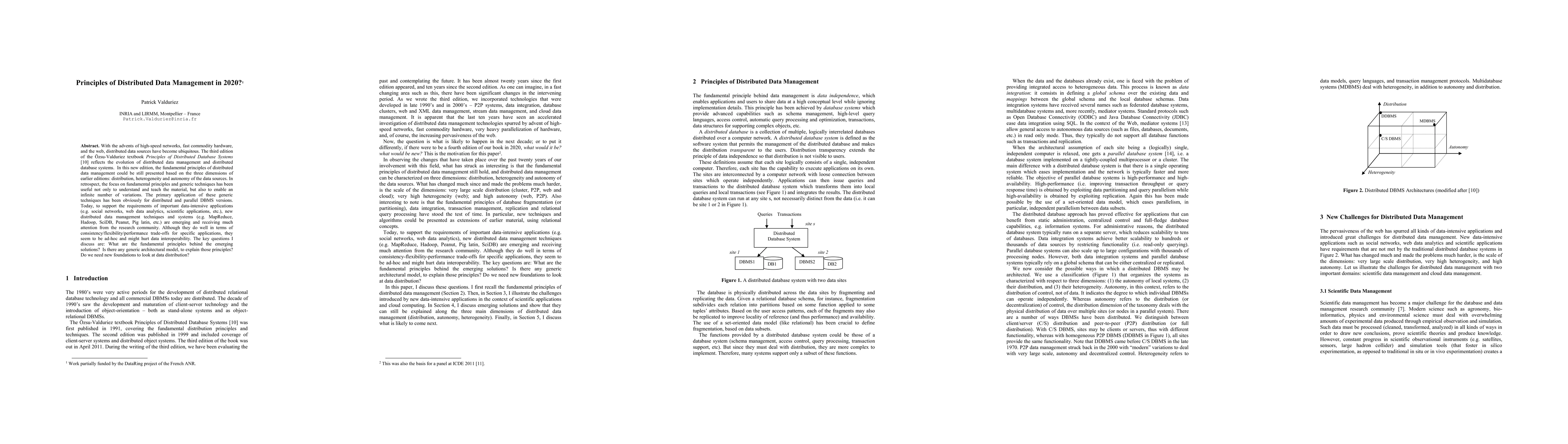 With the advents of high-speed networks, fast commodity hardware, and the web, distributed data sources have become ubiquitous. The third edition of the \"Ozsu-Valduriez textbook Principles of Distributed Database Systems [10] reflects the evolution of distributed data management and distributed database systems. In this new edition, the fundamental principles of distributed data management could be still presented based on the three dimensions of earlier editions: distribution, heterogeneity and autonomy of the data sources. In retrospect, the focus on fundamental principles and generic techniques has been useful not only to understand and teach the material, but also to enable an infinite number of variations. The primary application of these generic techniques has been obviously for distributed and parallel DBMS versions. Today, to support the requirements of important data-intensive applications (e.g. social networks, web data analytics, scientific applications, etc.), new distributed data management techniques and systems (e.g. MapReduce, Hadoop, SciDB, Peanut, Pig latin, etc.) are emerging and receiving much attention from the research community. Although they do well in terms of consistency/flexibility/performance trade-offs for specific applications, they seem to be ad-hoc and might hurt data interoperability. The key questions I discuss are: What are the fundamental principles behind the emerging solutions? Is there any generic architectural model, to explain those principles? Do we need new foundations to look at data distribution?