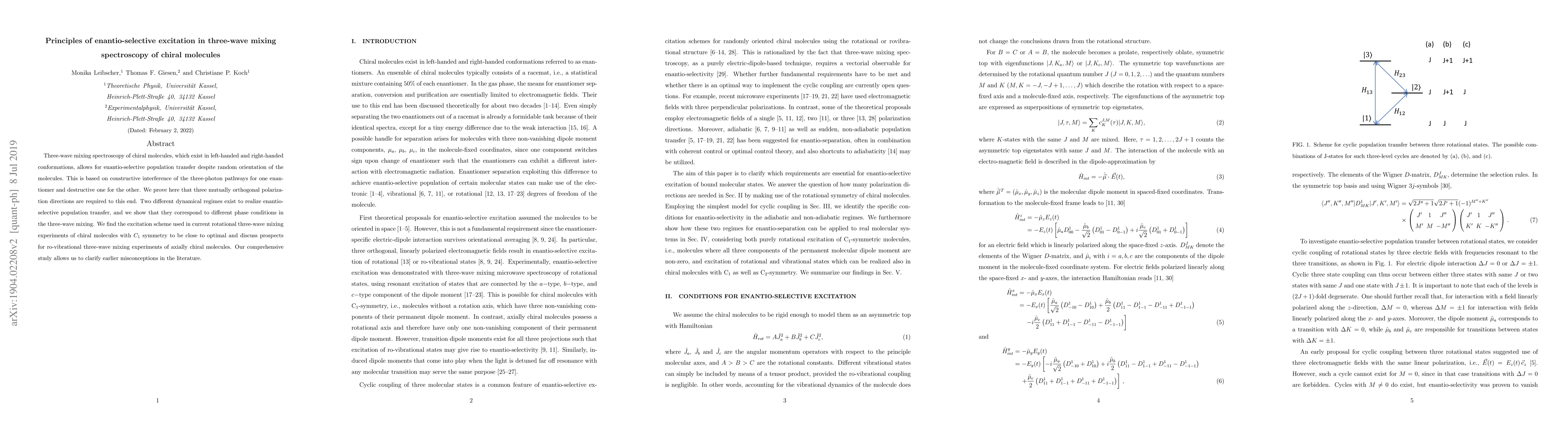 This paper explores enantio-selective excitation in three-wave mixing spectroscopy of chiral molecules, demonstrating that three mutually orthogonal polarization directions are essential for achieving this selectivity. It identifies two dynamical regimes for enantio-selective population transfer and discusses the optimization of current experimental setups for chiral molecules.