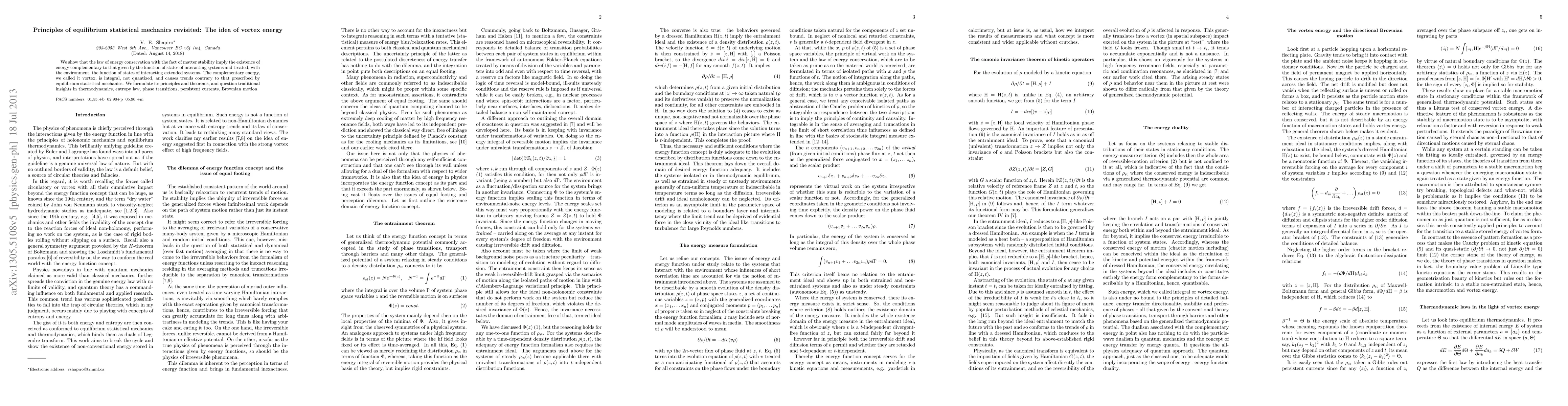We show that the law of energy conservation with the fact of matter stability imply the existence of energy complementary to that given by the function of states of interacting systems and treated, with the environment, the function of states of interacting extended systems. The complementary energy, we called it vortex, is integral, not quantized, and causes trends contrary to that prescribed by equilibrium statistical mechanics. We formulate its principles and theorems, and question traditional insights in thermodynamics, entropy law, phase transitions, persistent currents, Brownian motion.