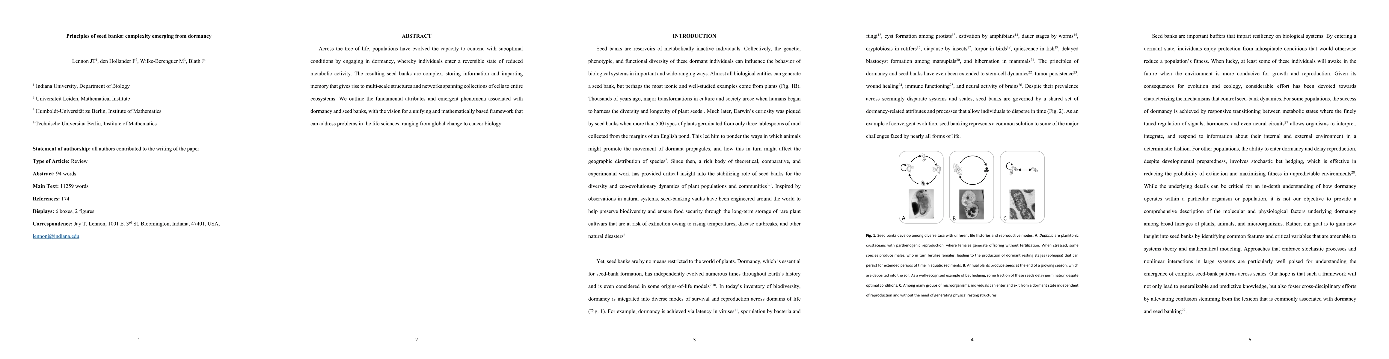 This paper explores the complexity of seed banks, which are formed through dormancy, a state of reduced metabolic activity that allows populations to survive suboptimal conditions. It discusses the fundamental attributes and emergent phenomena of seed banks, aiming to develop a unifying mathematical framework to address diverse life science issues, from global change to cancer biology.