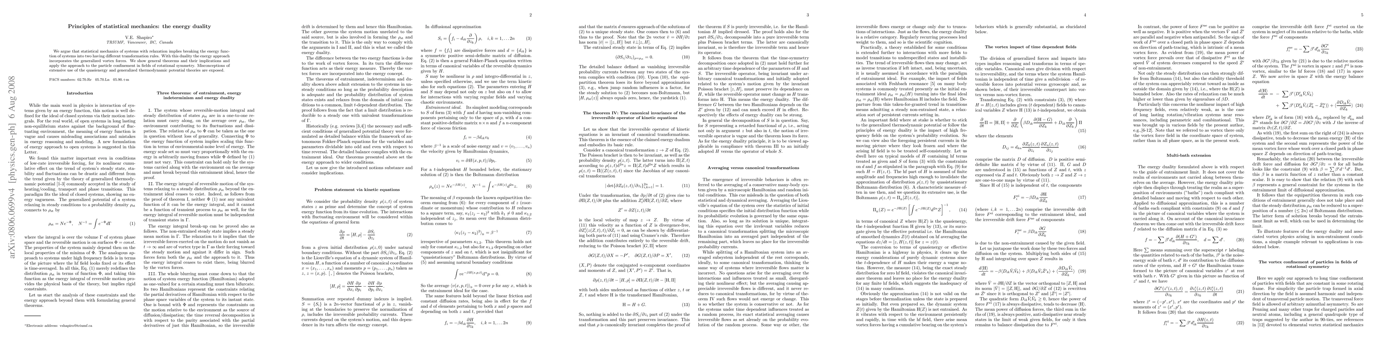 This paper introduces an energy duality in statistical physics, proposing that systems with relaxation can be represented by two distinct energy functions with different transformation rules. This approach incorporates generalized vortex forces and corrects misconceptions about quasienergy and thermodynamic potential theories.