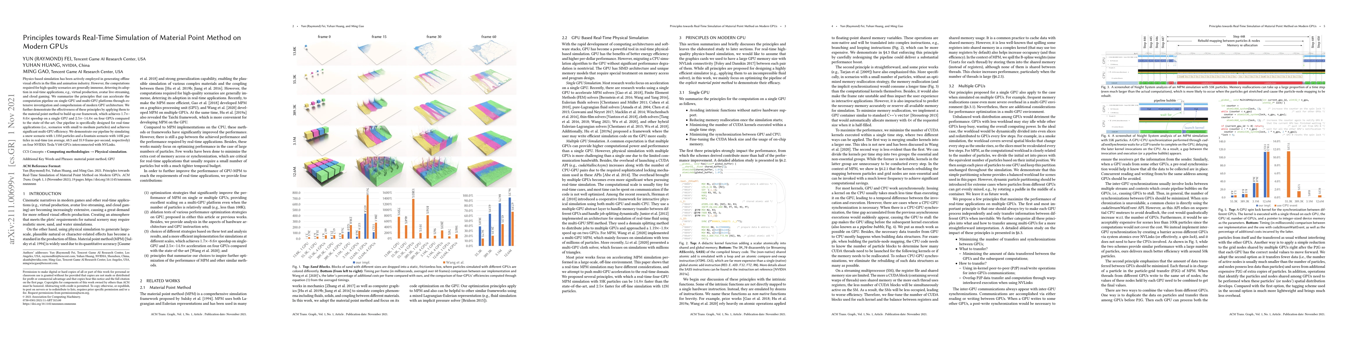 This research paper introduces principles to accelerate material point method simulation on modern GPUs, achieving significant speedups for real-time applications like virtual production and cloud gaming.