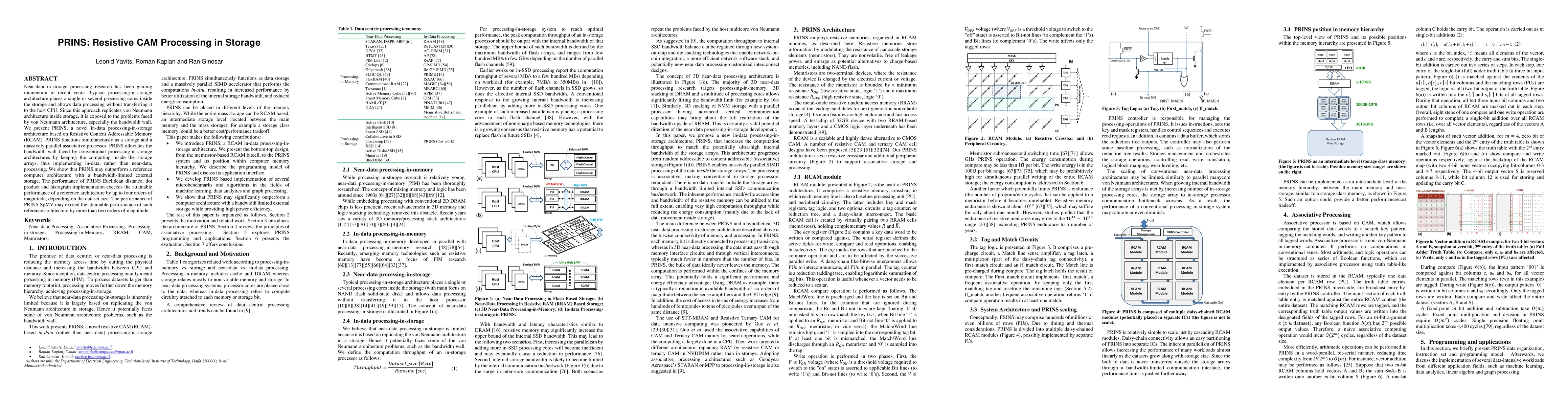 Near-data in-storage processing research has been gaining momentum in recent years. Typical processing-in-storage architecture places a single or several processing cores inside the storage and allows data processing without transferring it to the host CPU. Since this approach replicates von Neumann architecture inside storage, it is exposed to the problems faced by von Neumann architecture, especially the bandwidth wall. We present PRINS, a novel in-data processing-in-storage architecture based on Resistive Content Addressable Memory (RCAM). PRINS functions simultaneously as a storage and a massively parallel associative processor. PRINS alleviates the bandwidth wall faced by conventional processing-in-storage architectures by keeping the computing inside the storage arrays, thus implementing in-data, rather than near-data, processing. We show that PRINS may outperform a reference computer architecture with a bandwidth-limited external storage. The performance of PRINS Euclidean distance, dot product and histogram implementation exceeds the attainable performance of a reference architecture by up to four orders of magnitude, depending on the dataset size. The performance of PRINS SpMV may exceed the attainable performance of such reference architecture by more than two orders of magnitude.