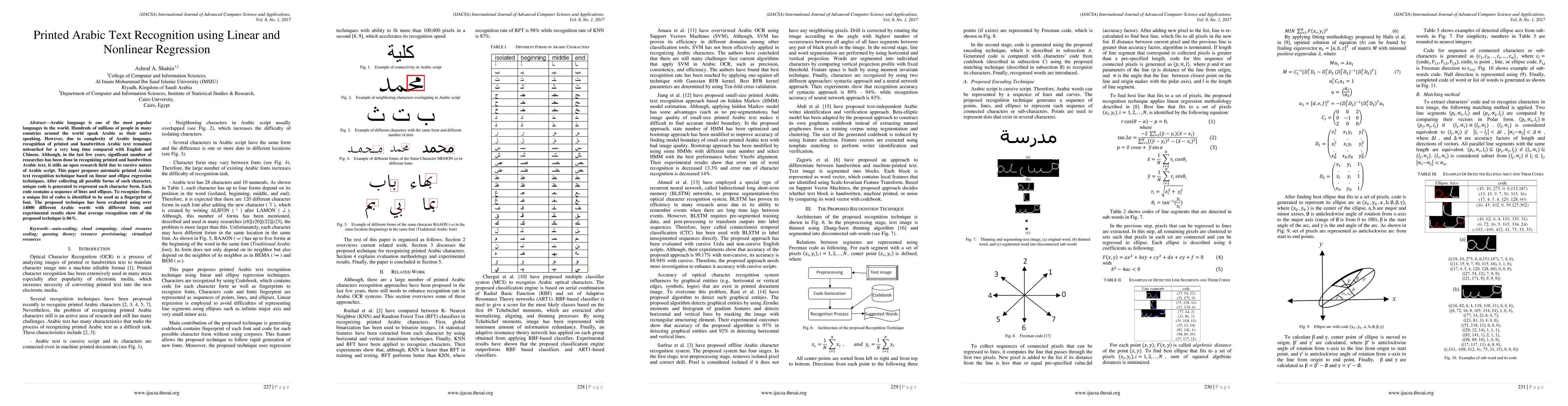 This paper proposes an automatic printed Arabic text recognition method using linear and ellipse regression techniques. The method generates unique codes for character forms and uses these as font fingerprints, achieving an average recognition rate of 86% across 14,000 words in various fonts.