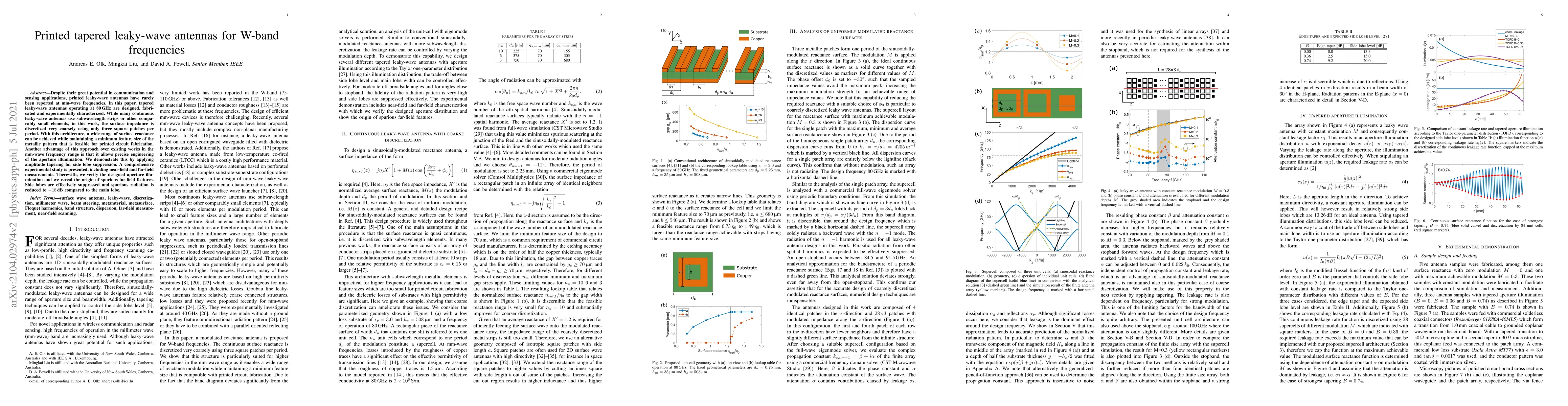 This paper designs and fabricates printed tapered leaky-wave antennas for 80 GHz W-band frequencies, achieving effective side lobe suppression and minimal spurious radiation through a coarsely discretized surface impedance and a tapered aperture illumination. Experimental results confirm the effectiveness of the design.