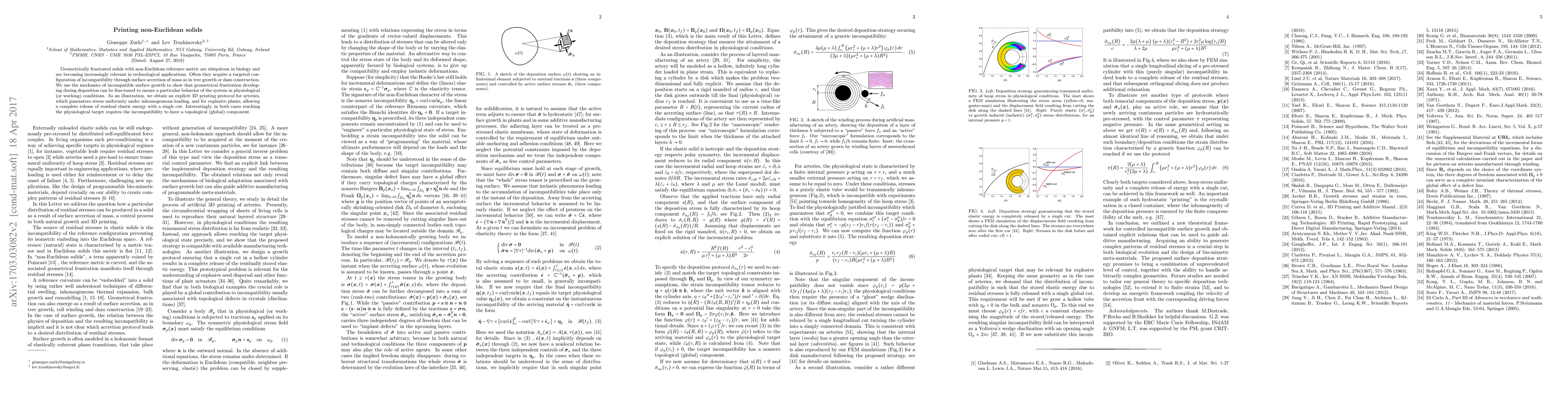 Geometrically frustrated solids with non-Euclidean reference metric are ubiquitous in biology and are becoming increasingly relevant in technological applications. Often they acquire a targeted con- figuration of incompatibility through surface accretion of mass as in tree growth or dam construction. We use the mechanics of incompatible surface growth to show that geometrical frustration develop- ing during deposition can be fine-tuned to ensure a particular behavior of the system in physiological (or working) conditions. As an illustration, we obtain an explicit 3D printing protocol for arteries, which guarantees stress uniformity under inhomogeneous loading, and for explosive plants, allowing a complete release of residual elastic energy with a single cut. Interestingly, in both cases reaching the physiological target requires the incompatibility to have a topological (global) component.